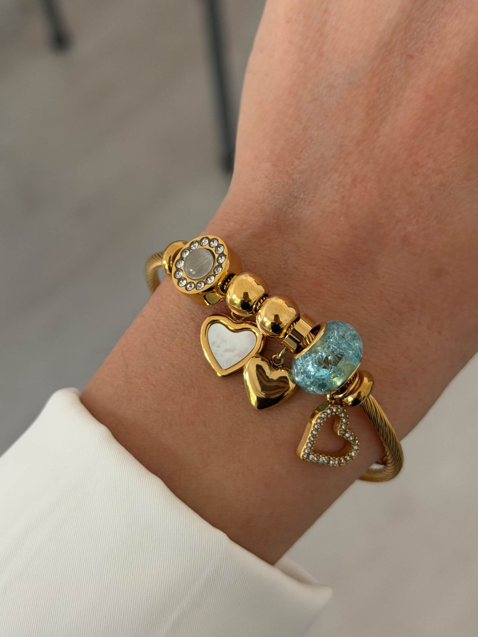 Εντυπωσιακό βραχιόλι τύπου bangle με charms καρδιάς και λαμπερές λεπτομέρειες στρας, συνδυασμένο με γαλάζια κρυστάλλινη χάντρα που θυμίζει θάλασσα. Ρομαντικό και κομψό, ιδανικό για να φορεθεί μόνο του ή σε layering. Διατίθεται σε χρυσό και ασημί τόνο.