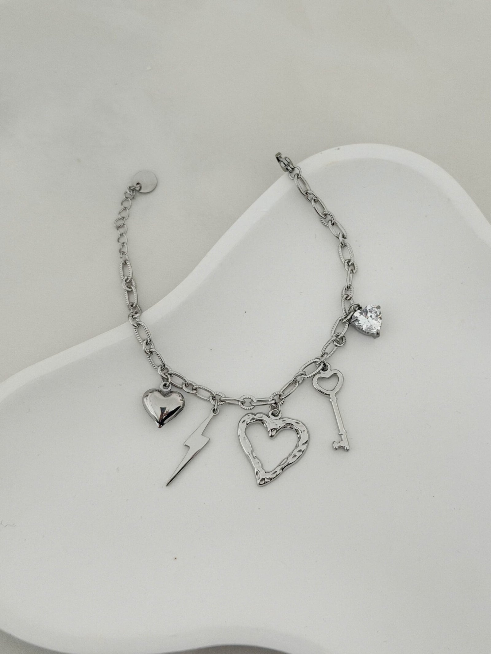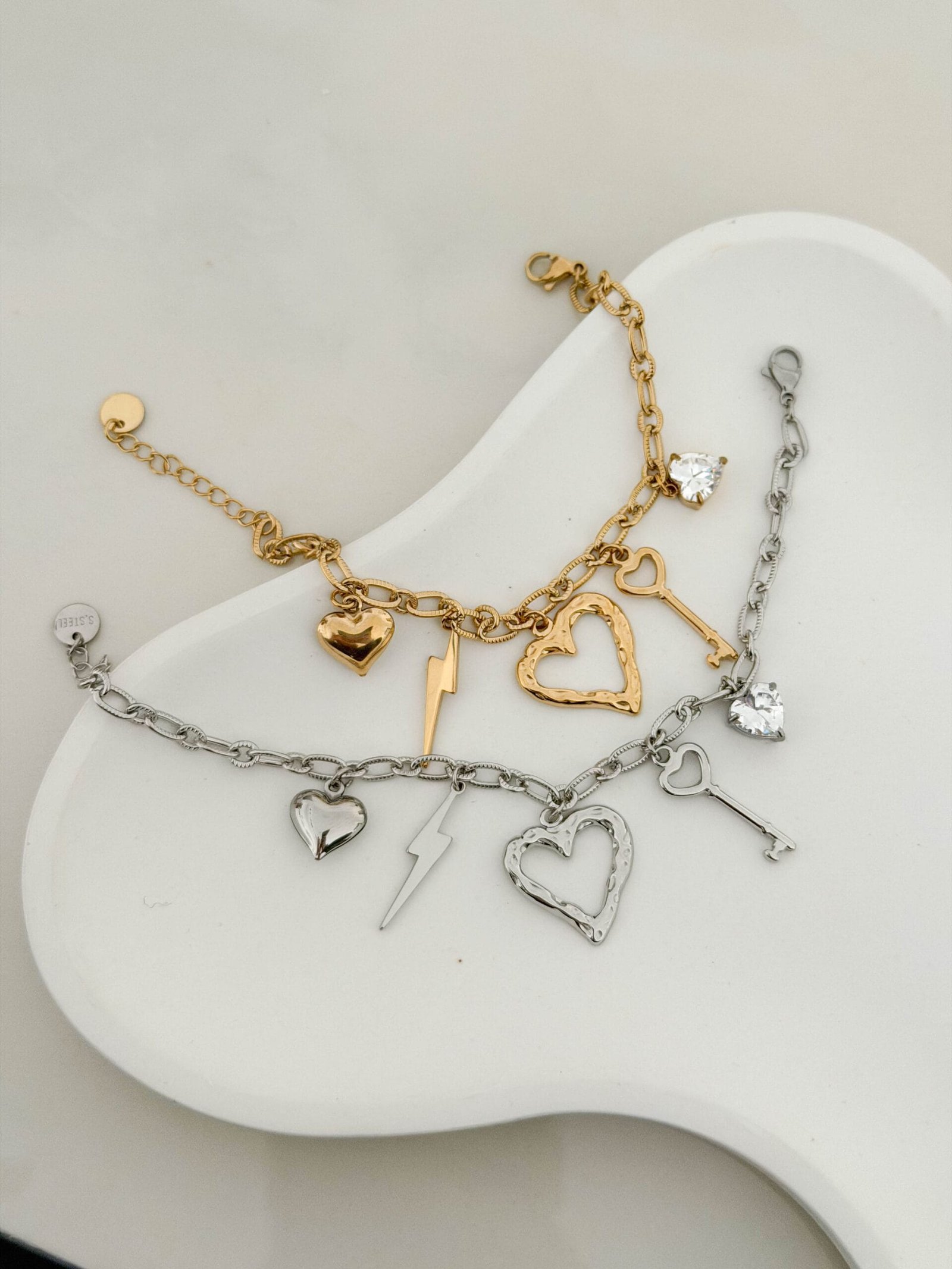 Λεπτό βραχιόλι με charms καρδιάς και κλειδιού, σύμβολα αγάπης και σύνδεσης. Διαθέσιμο σε χρυσό και ασημί τόνο, ιδανικό για καθημερινή χρήση ή ως ρομαντικό δώρο.