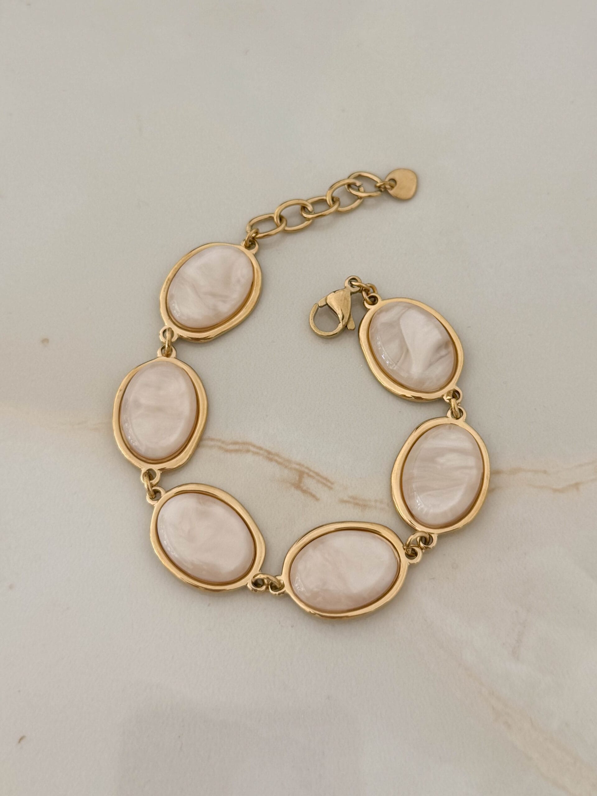 Βραχιόλι από ανοξείδωτο ατσάλι σε χρυσό τόνο με οβάλ nude πέτρες. Ένα κομψό ανοιξιάτικο-καλοκαιρινό κόσμημα που προσθέτει φρεσκάδα και χρώμα σε κάθε εμφάνιση.