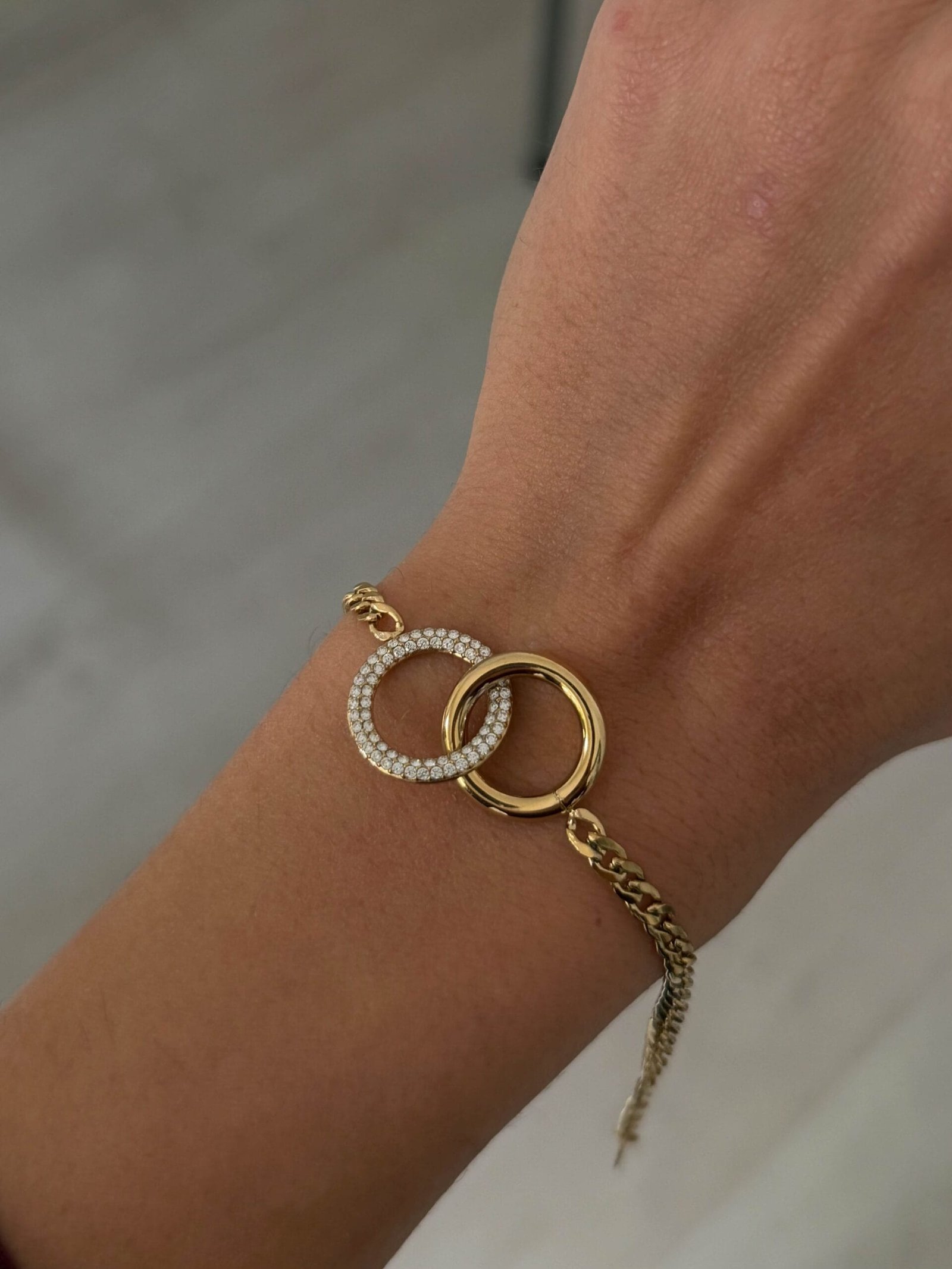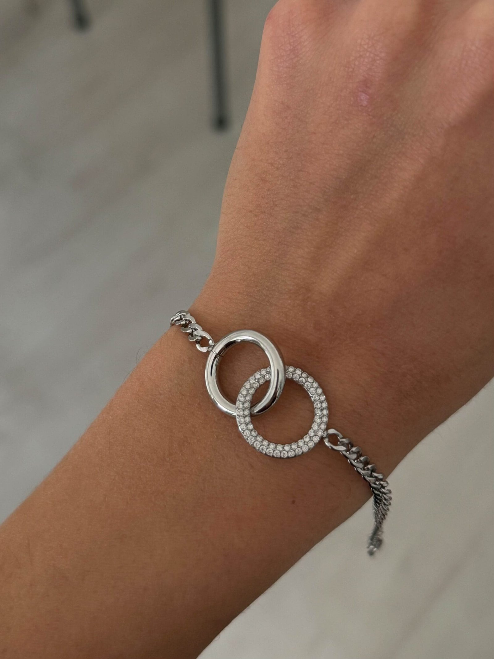 Κομψό και διαχρονικό βραχιόλι με αλυσίδα και δύο αλληλένδετους κρίκους, που συμβολίζουν τη σύνδεση και την αρμονία. Ο ένας κρίκος διαθέτει λεία μεταλλική επιφάνεια, ενώ ο δεύτερος είναι διακοσμημένος με λαμπερά ζιργκόν, προσφέροντας μια ισορροπία ανάμεσα στο minimal και τη διακριτική λάμψη.