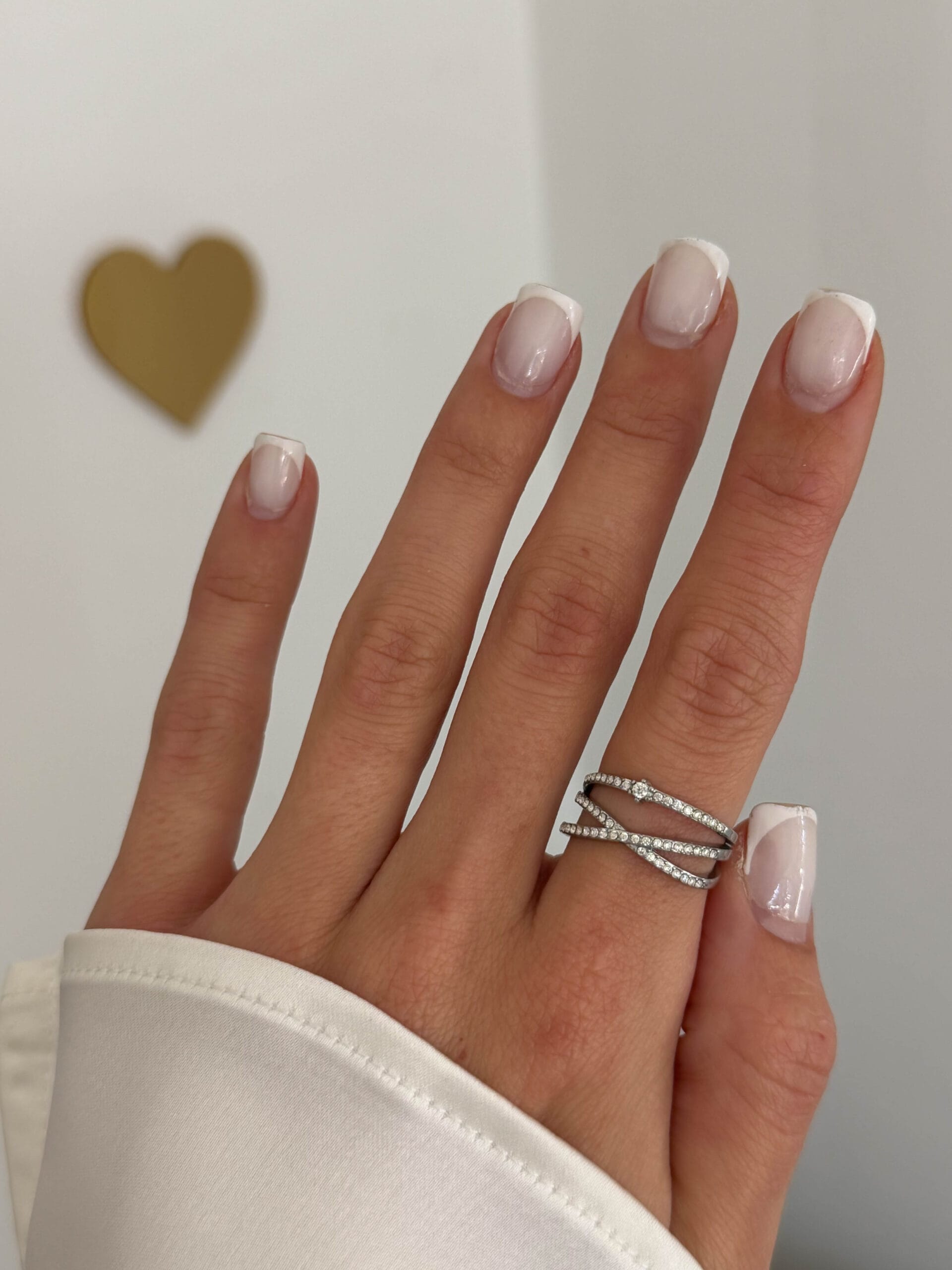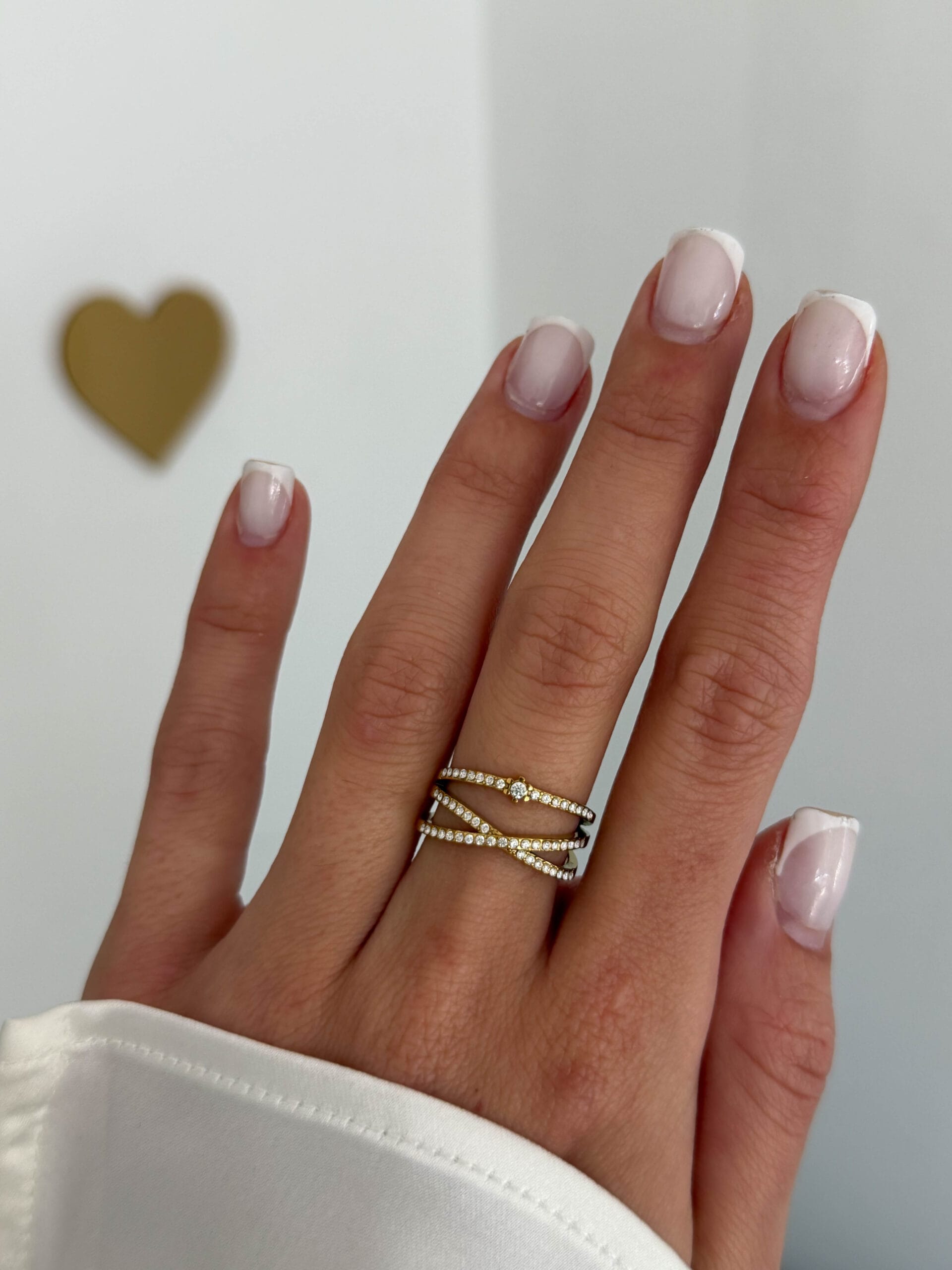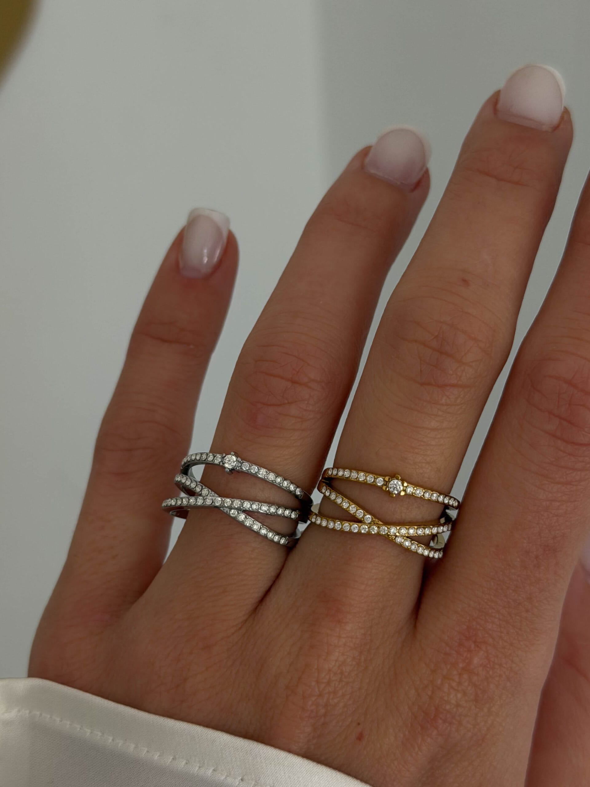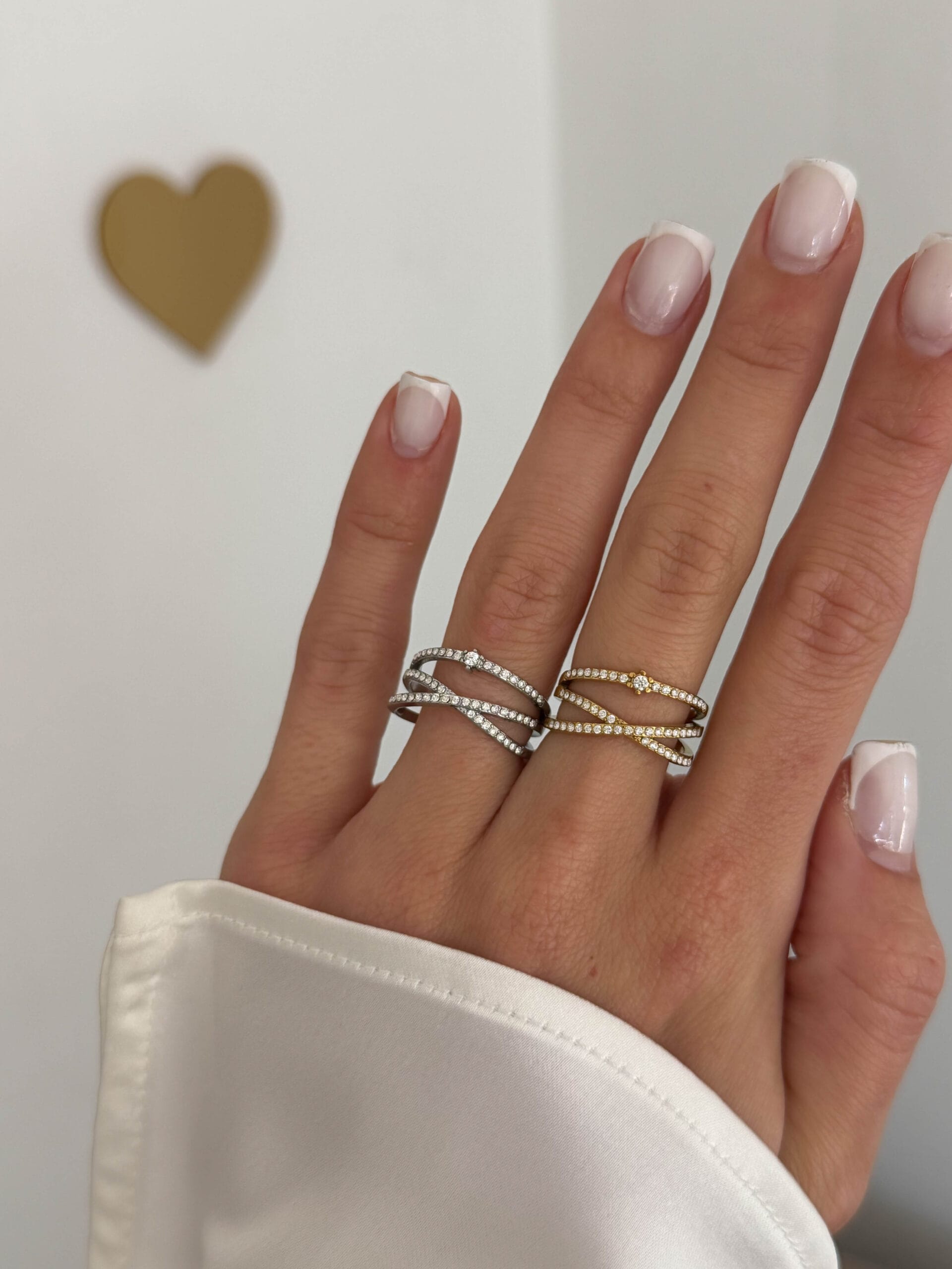 Δαχτυλίδι από ανοξείδωτο ατσάλι με κομψό χιαστί σχεδιασμό και λαμπερά κρυσταλλάκια. Ένα μοντέρνο κόσμημα που προσθέτει διακριτική λάμψη σε κάθε εμφάνιση.