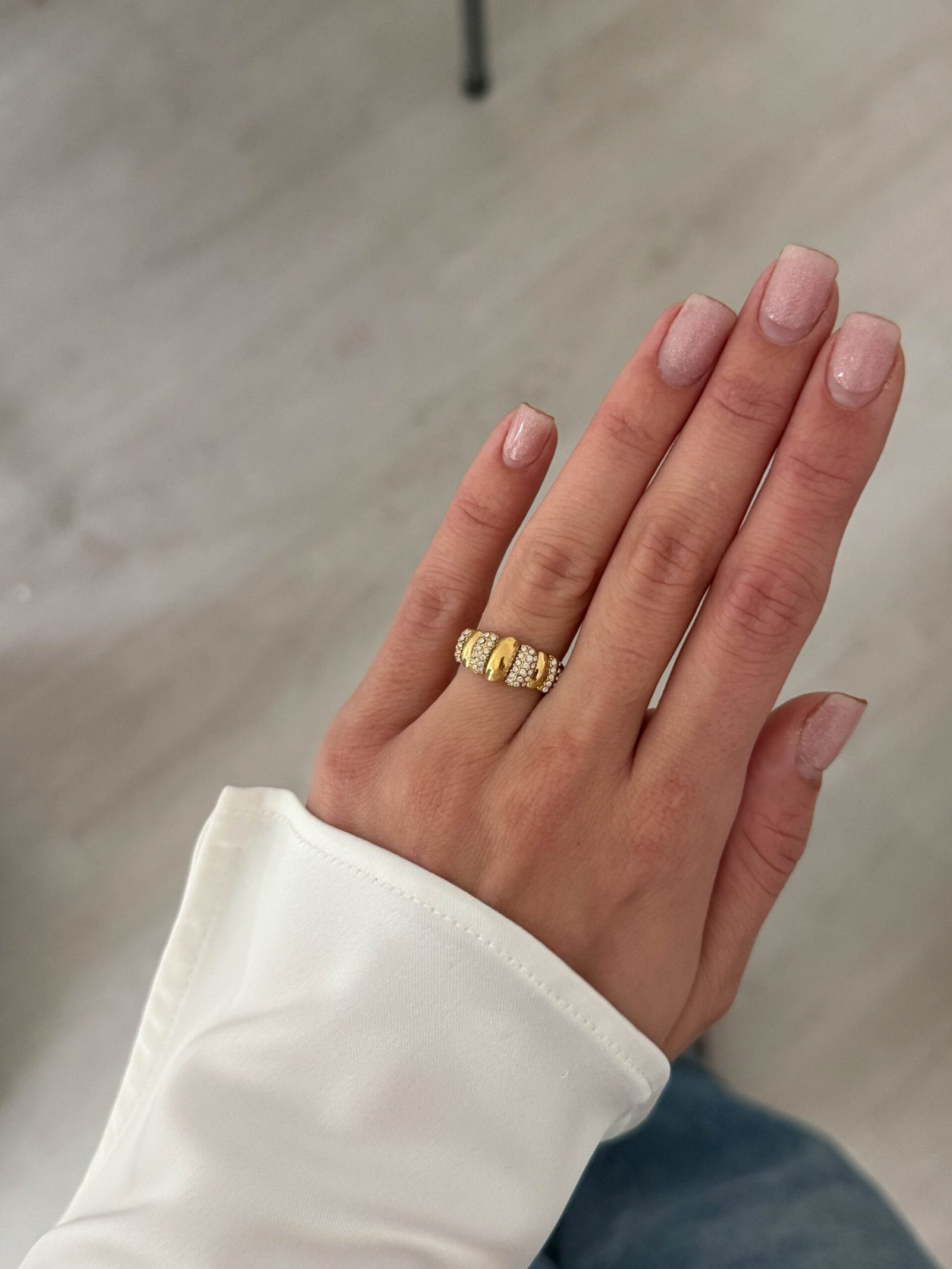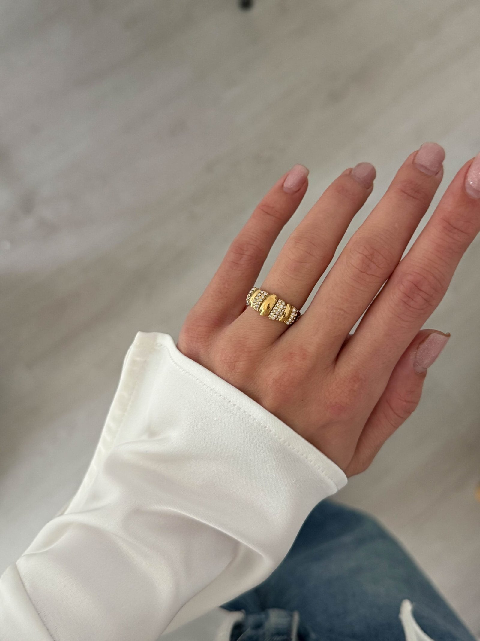 Εντυπωσιακό δαχτυλίδι με χρυσές λείες λεπτομέρειες και σειρές από λαμπερά στρας που προσφέρουν έντονη αλλά κομψή λάμψη. Statement κομμάτι, ιδανικό για να αναβαθμίσει κάθε εμφάνιση.