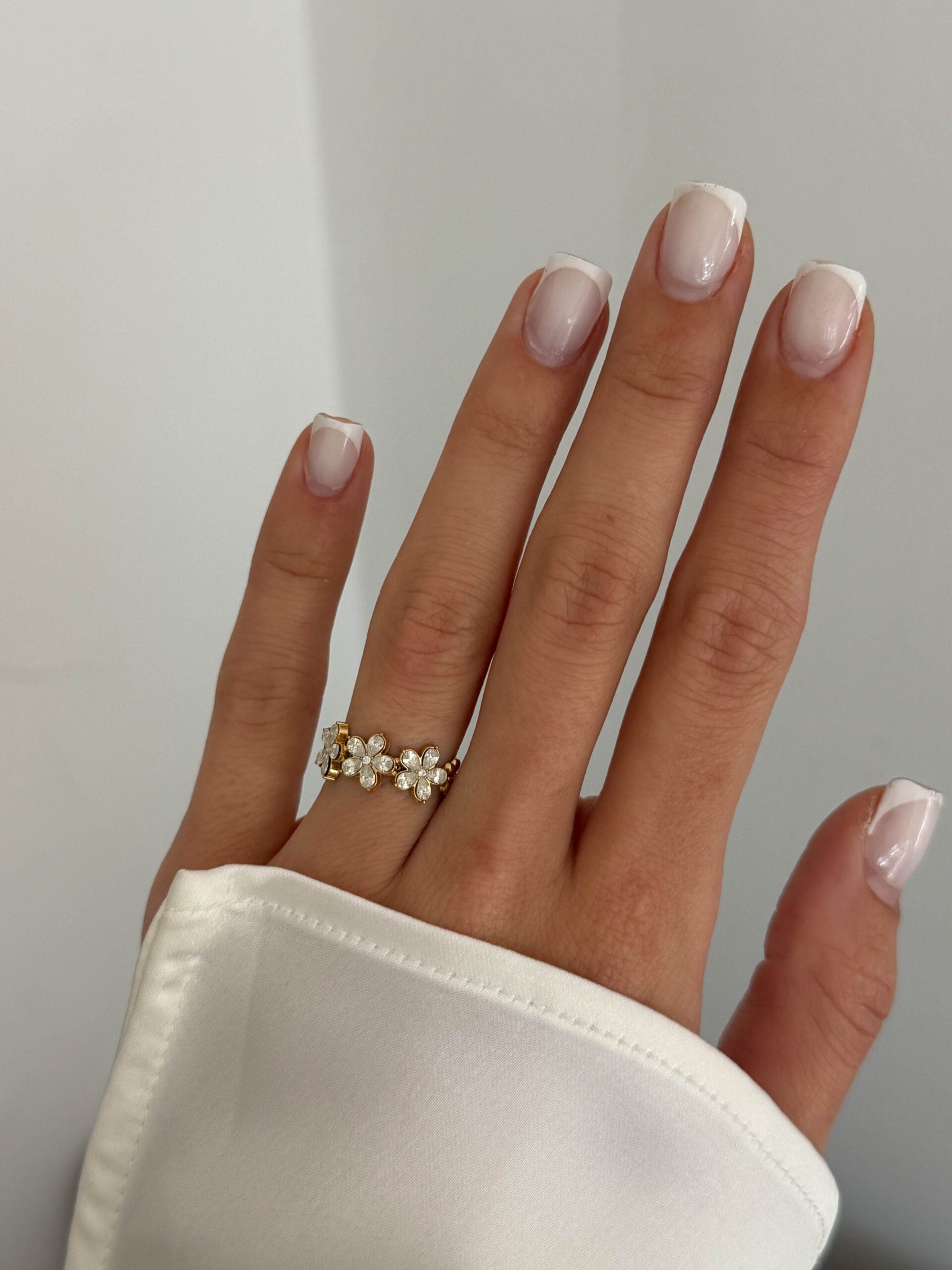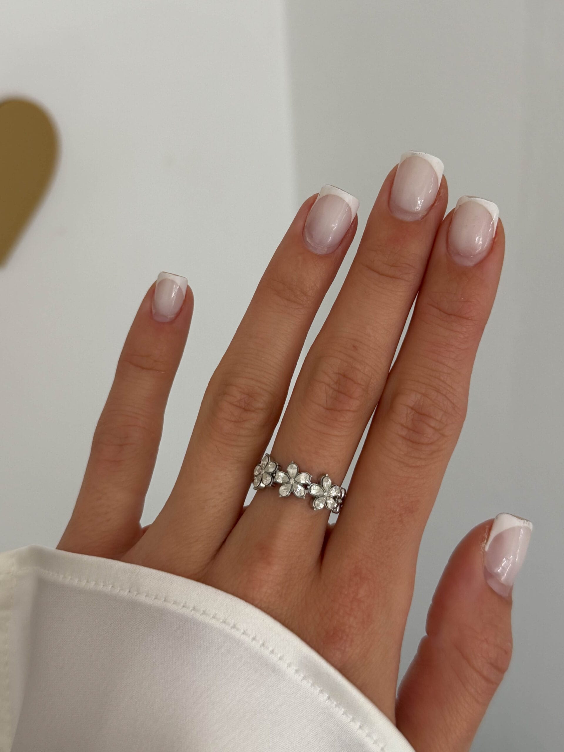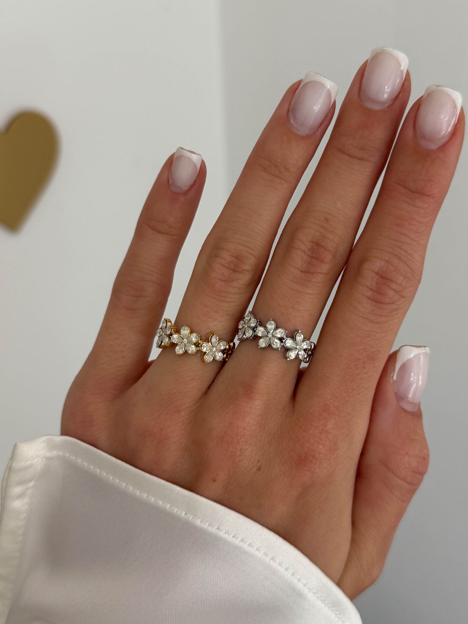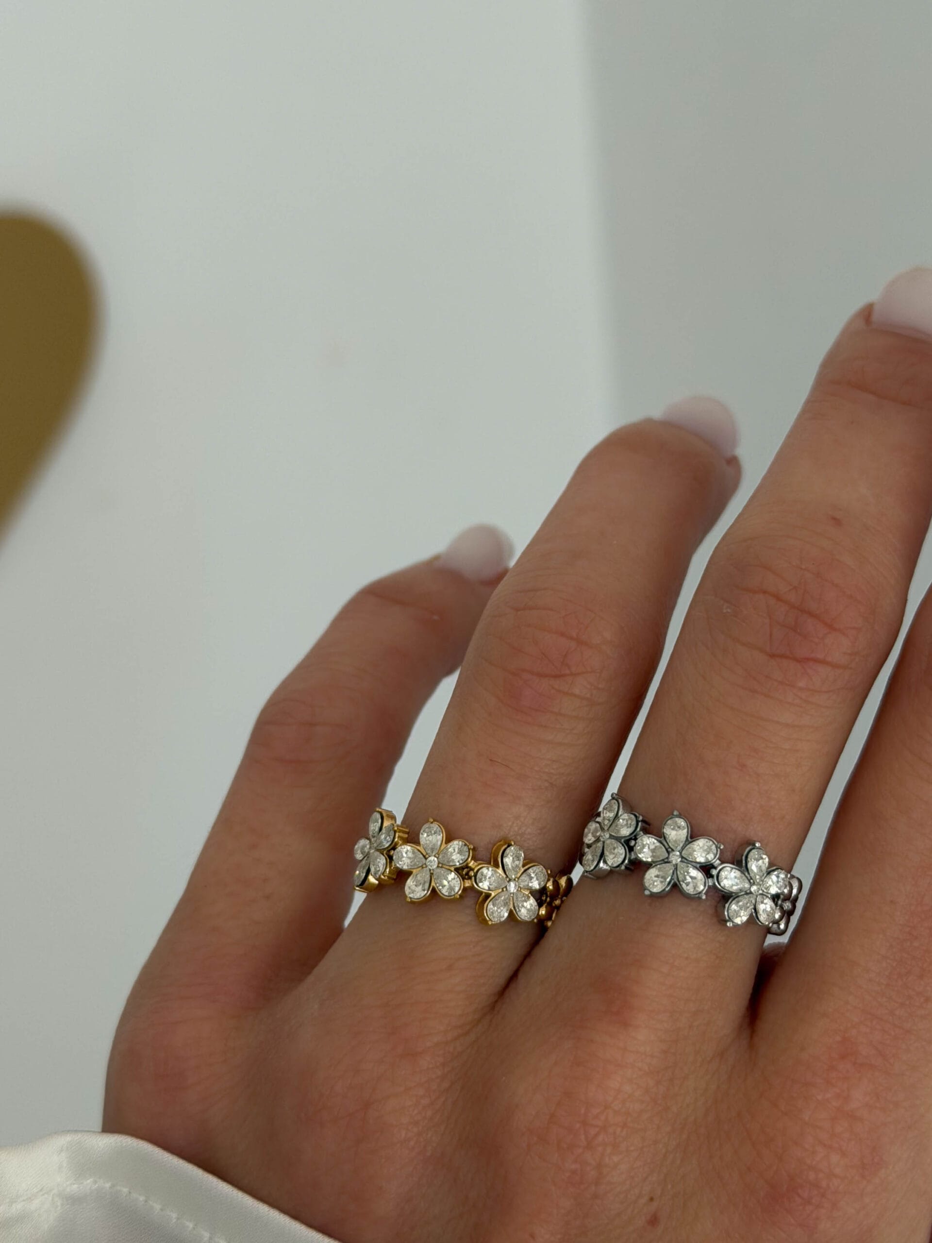 Δαχτυλίδι από ανοξείδωτο ατσάλι με μικρά λουλούδια και λαμπερά κρυσταλλάκια. Ένα ρομαντικό και κομψό κόσμημα που προσθέτει μια διακριτική λάμψη σε κάθε εμφάνιση.