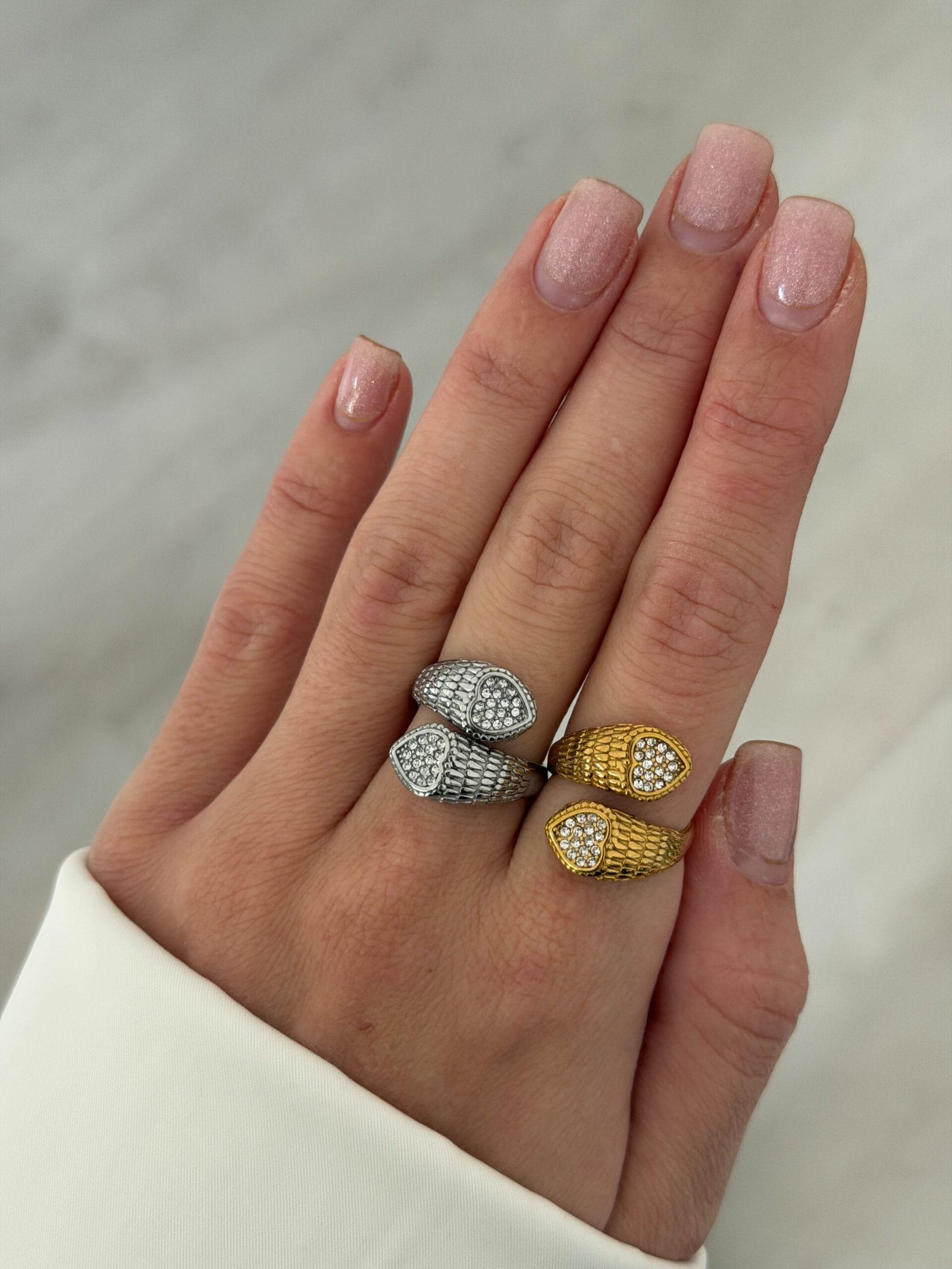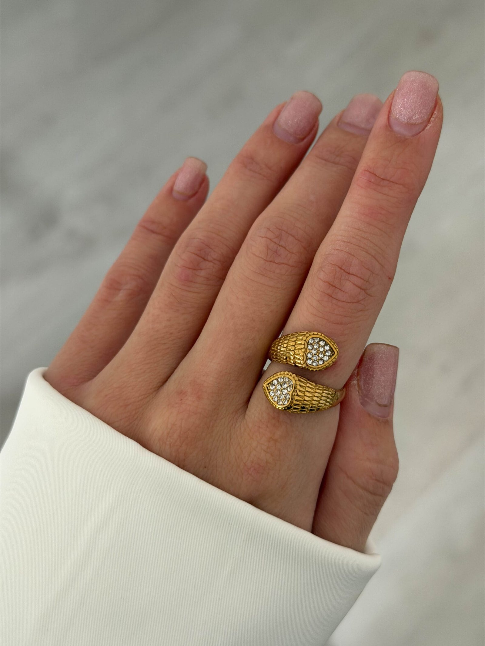 Εντυπωσιακό δαχτυλίδι εμπνευσμένο από τη μορφή φιδιού, με textured λεπτομέρειες και λαμπερά στρας στα τελειώματα που χαρίζουν δυναμική αλλά κομψή λάμψη. Ένα statement κόσμημα που προσθέτει χαρακτήρα και πολυτέλεια σε κάθε εμφάνιση, από casual looks έως βραδινές εξόδους.