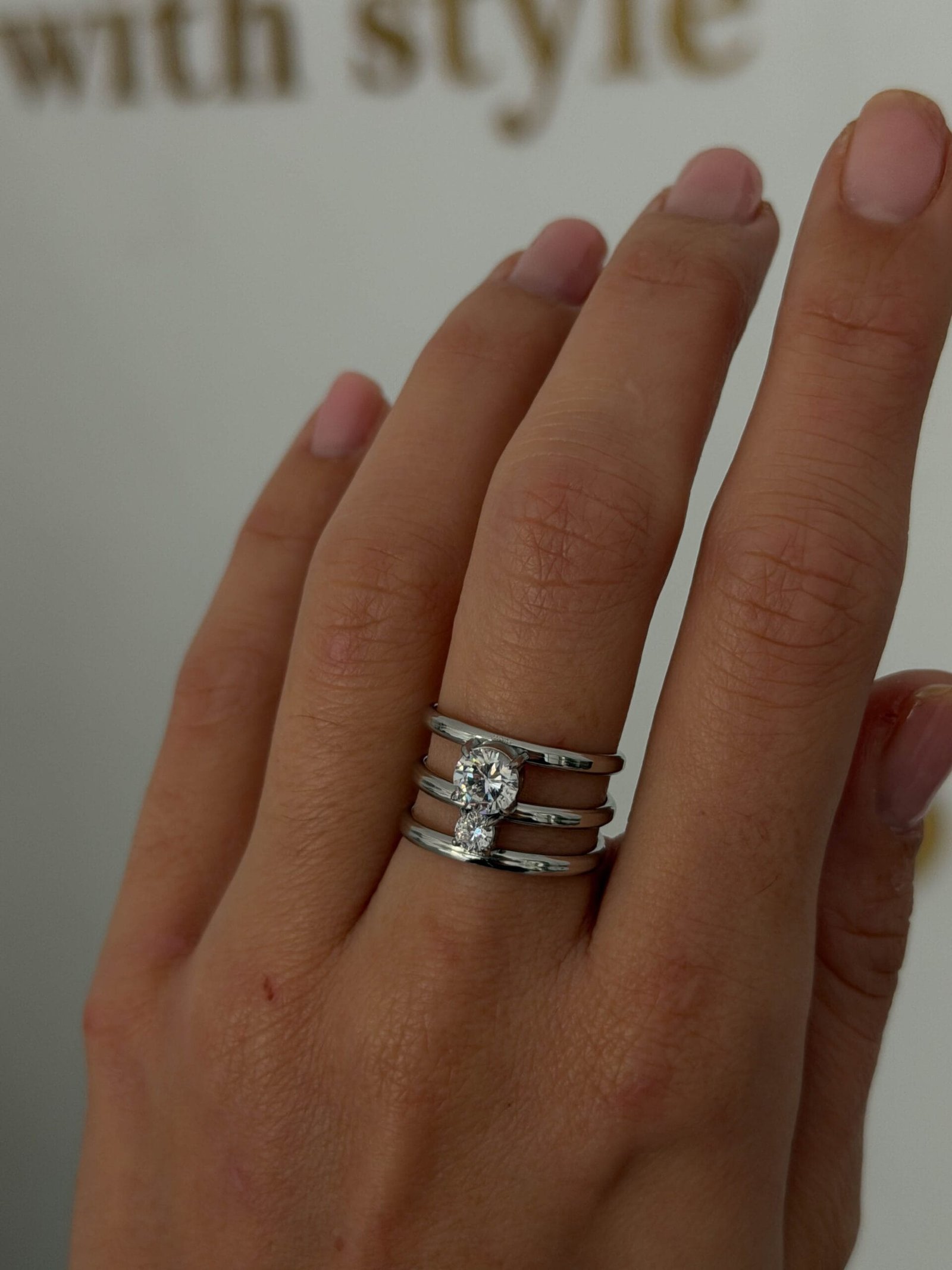 Το κεντρικό βεράκι φιλοξενεί ένα μεγάλο ζιργκόν, ενώ τα άλλα δύο βεράκια πλαισιώνουν ένα μικρότερο ζιργκόν, δημιουργώντας ένα εκλεπτυσμένο παιχνίδι φωτός και λάμψης. Ένα κομψό και διαχρονικό κόσμημα, ιδανικό για κάθε εμφάνιση.