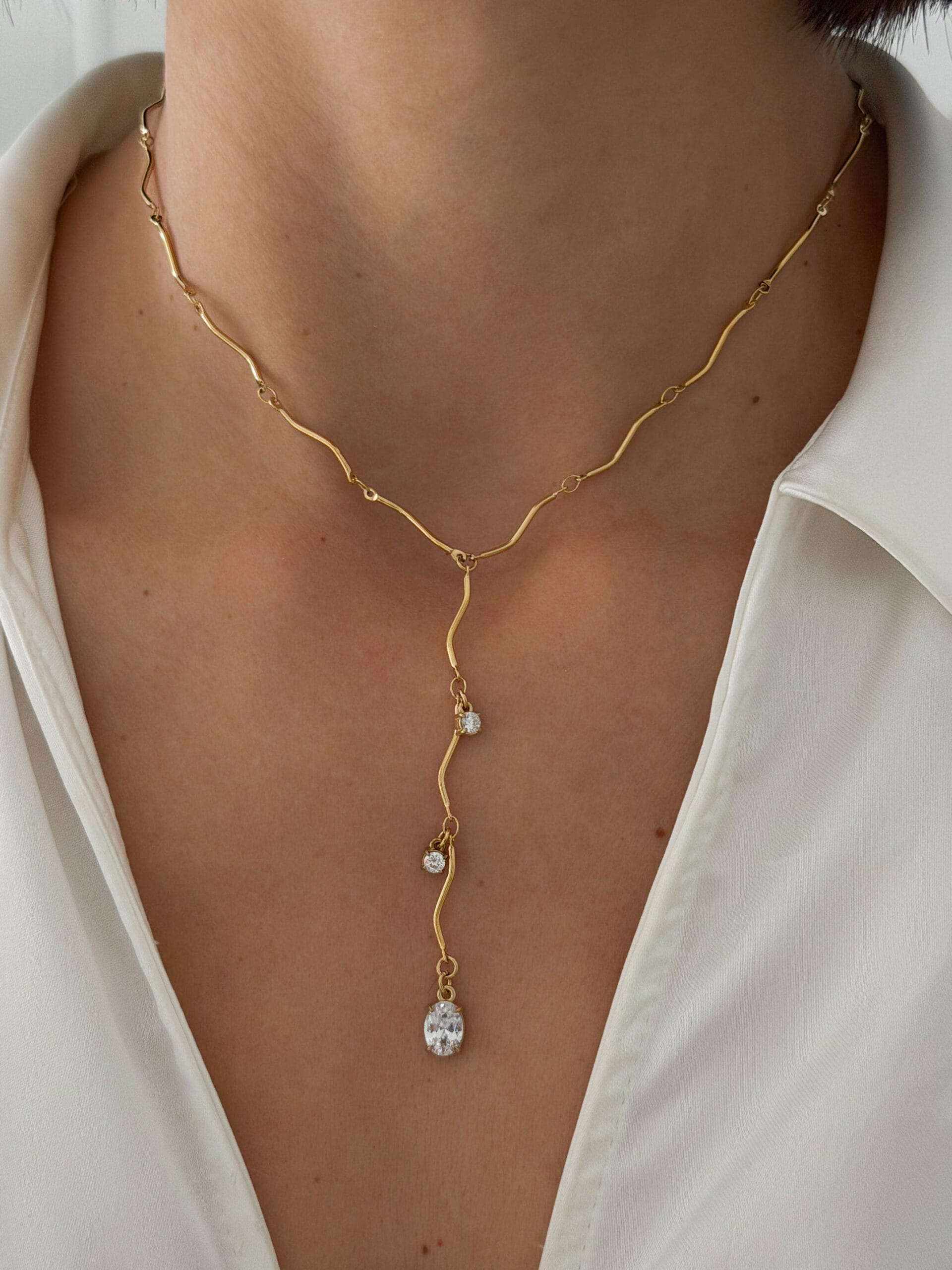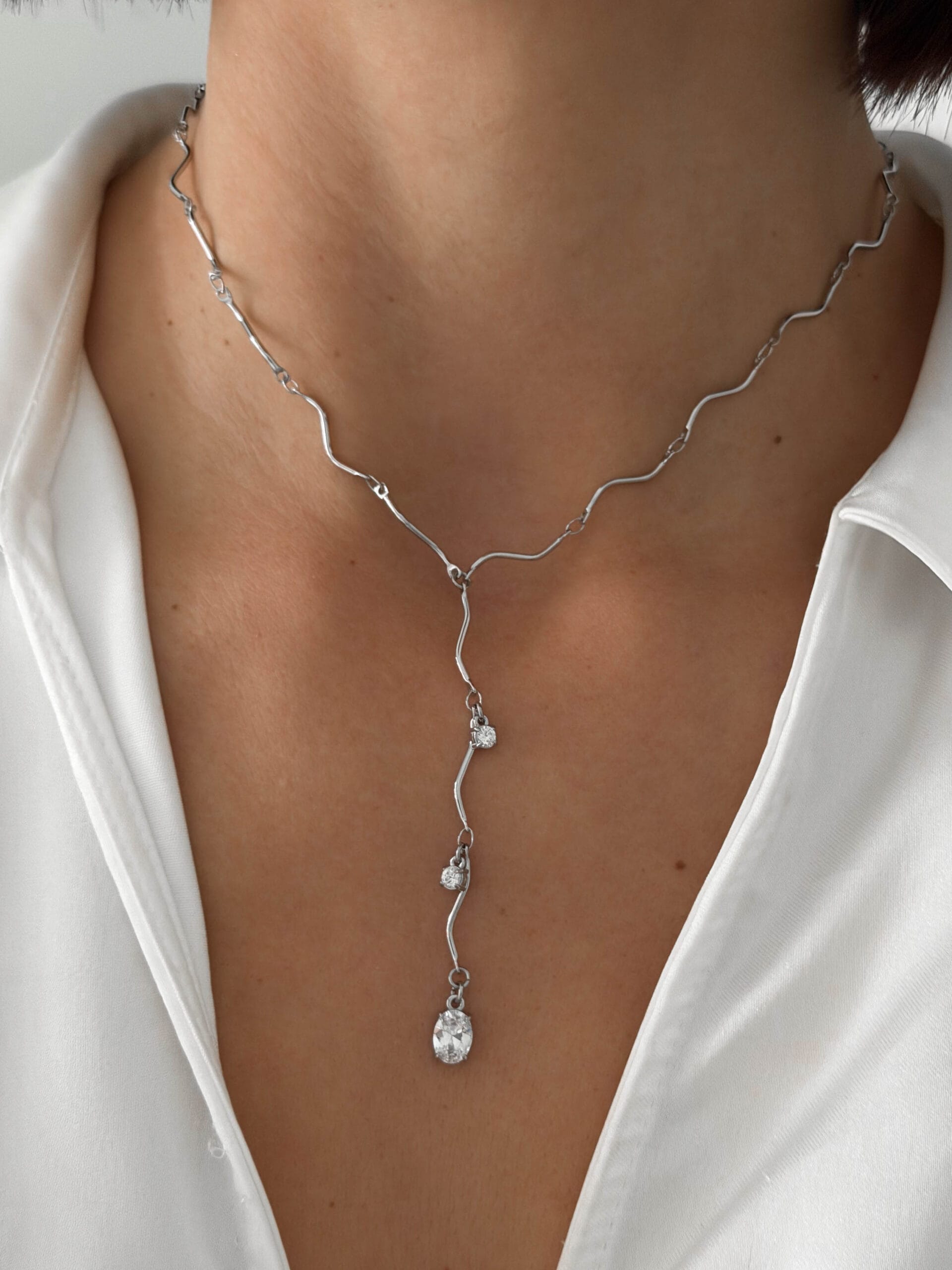 Ένα ιδιαίτερο κολιέ σε στυλ γραβάτας που ξεχωρίζει για τον μοντέρνο και θηλυκό σχεδιασμό του. Η κυματιστή αλυσίδα αγκαλιάζει κομψά τον λαιμό, ενώ στο τελείωμα τρία λαμπερά στρας προσθέτουν μία διακριτική αλλά εντυπωσιακή λάμψη. Ιδανικό για να αναβαθμίσει κάθε outfit, από minimal looks μέχρι πιο βραδινές εμφανίσεις.