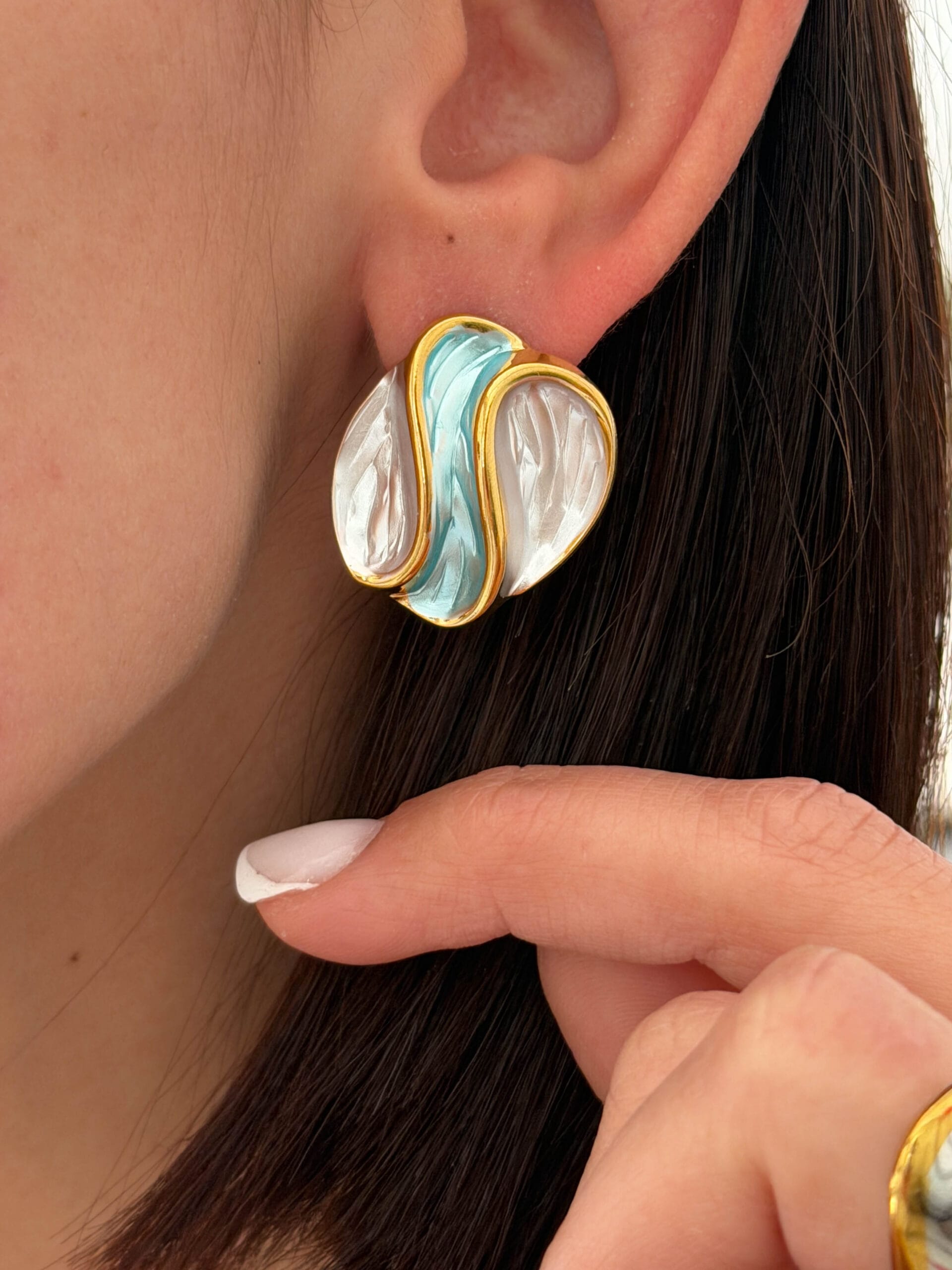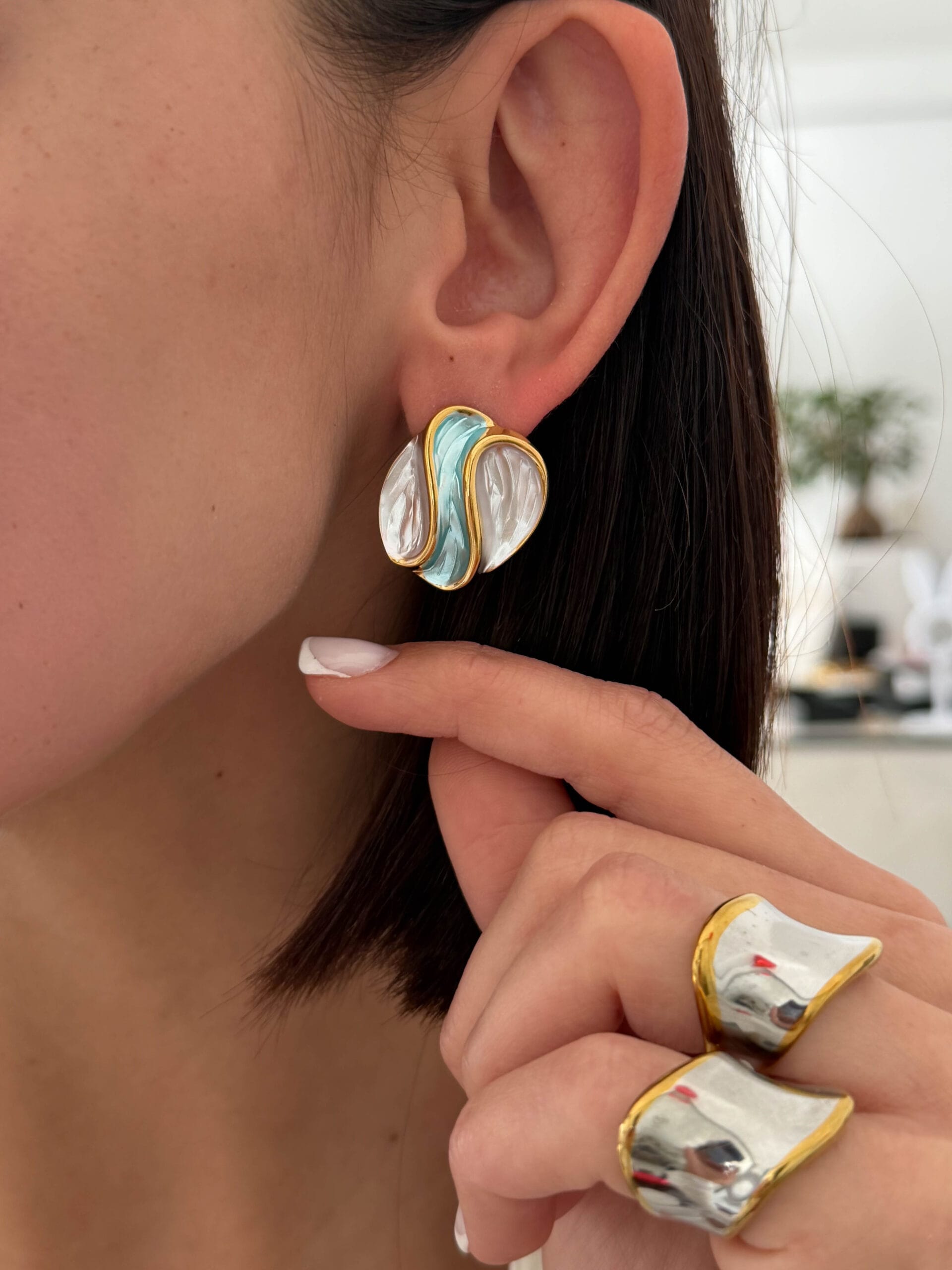 Εντυπωσιακά σκουλαρίκια με μοντέρνο abstract σχεδιασμό σε περλέ και γαλάζιες αποχρώσεις που δημιουργούν ένα κομψό και ιδιαίτερο αποτέλεσμα. Το μοναδικό τους σχήμα τα κάνει ιδανικά για εμφανίσεις που θέλουν να ξεχωρίζουν με στυλ.