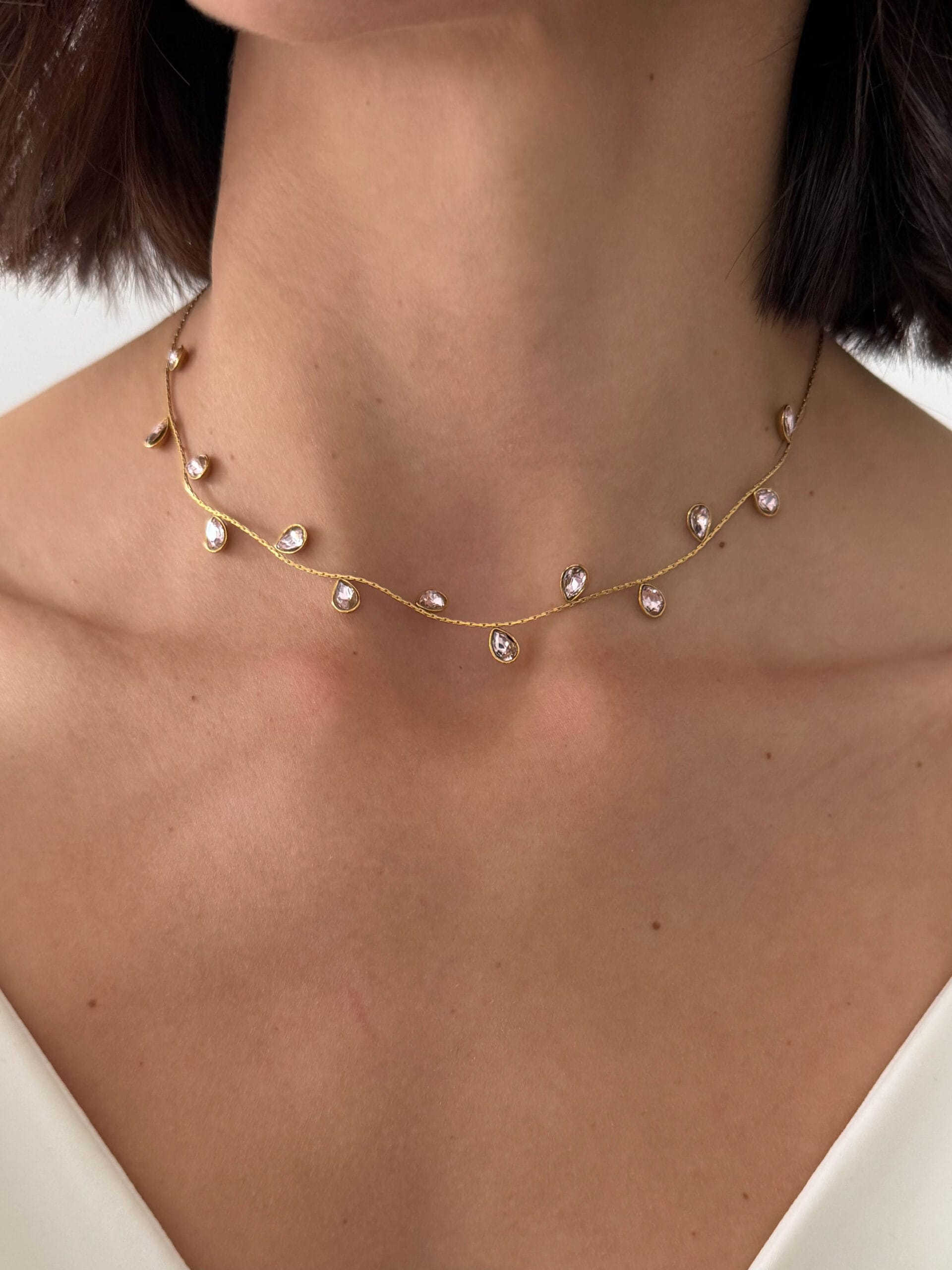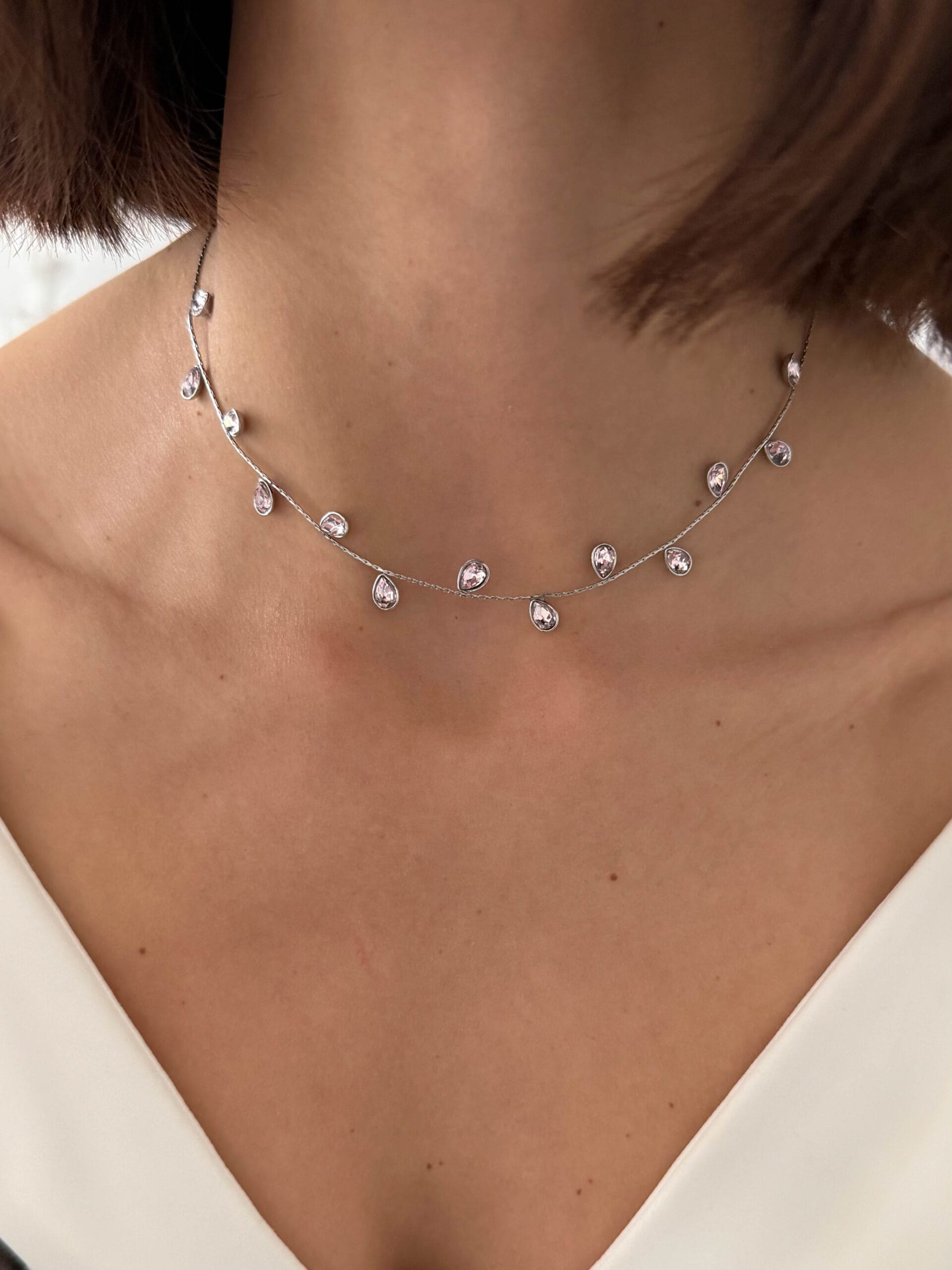 Κολιέ από ανοξείδωτο ατσάλι σε ασημί τόνο με ροζ κρυσταλλάκια σε σχήμα σταγόνας. Ένα ρομαντικό και minimal κόσμημα που προσθέτει διακριτική λάμψη.