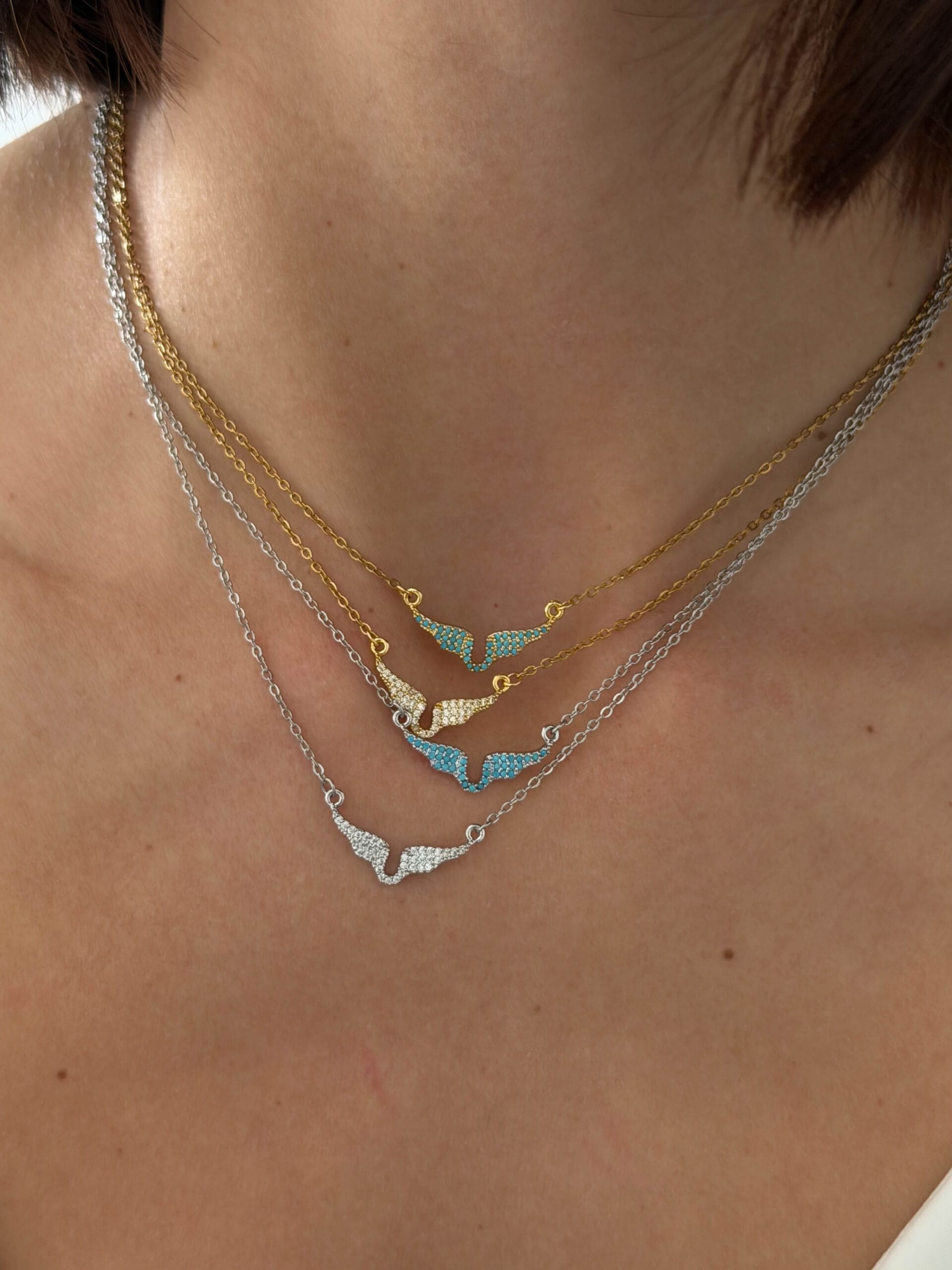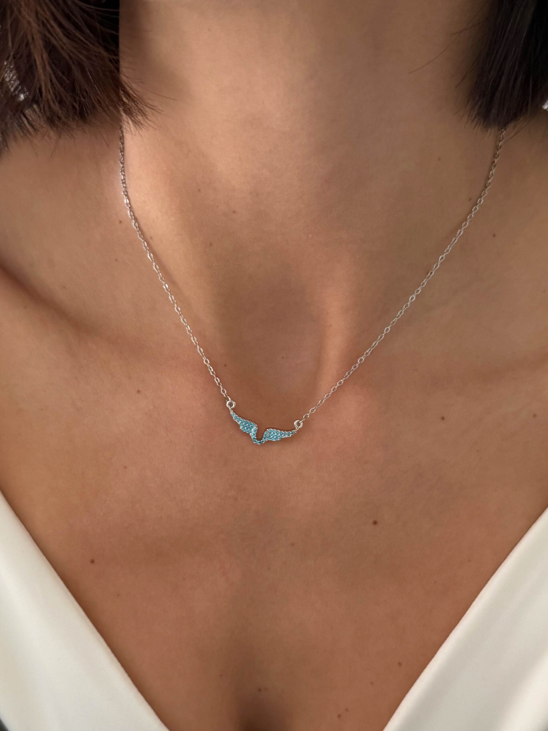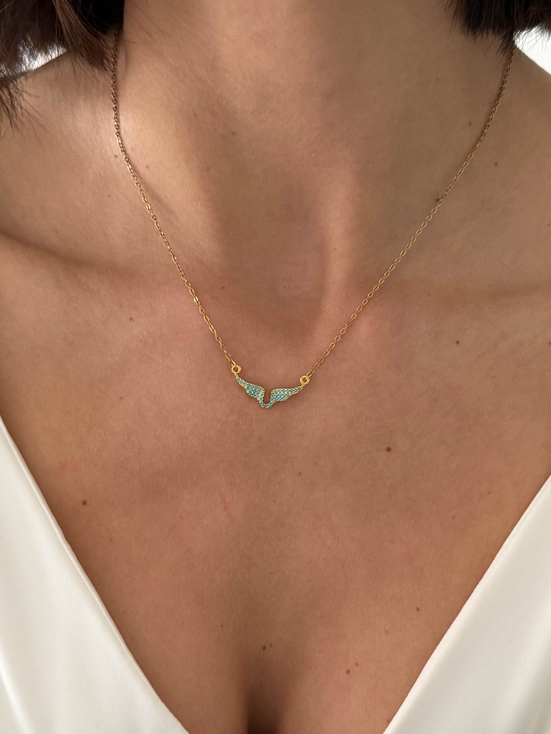 Κολιέ από ανοξείδωτο ατσάλι με σχέδιο φτερών και τιρκουάζ κρυσταλλάκια. Ένα κομψό και minimal κόσμημα που προσθέτει διακριτική λάμψη και χρώμα σε κάθε εμφάνιση. Διατίθεται σε χρυσό και ασημί τόνο.