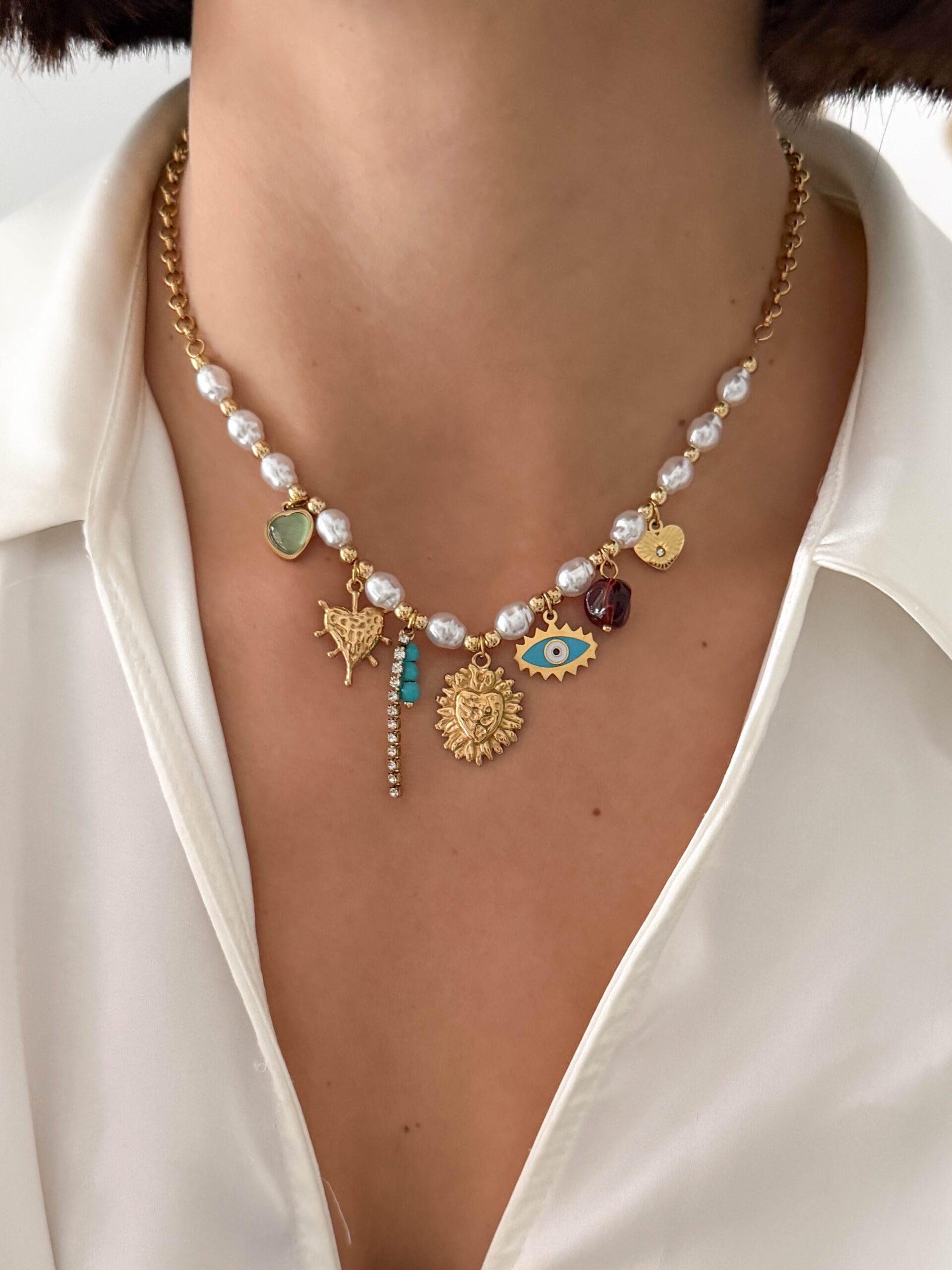 Μοναδικό κολιέ με πέρλες και διακοσμητικά charms που συνδυάζουν σύμβολα και χρώματα για ένα ιδιαίτερο, statement αποτέλεσμα. Ο συνδυασμός των περλών με τα χρυσά στοιχεία και τα charms χαρίζει έναν elegant αλλά ταυτόχρονα playful χαρακτήρα, ιδανικό για ξεχωριστές εμφανίσεις.
