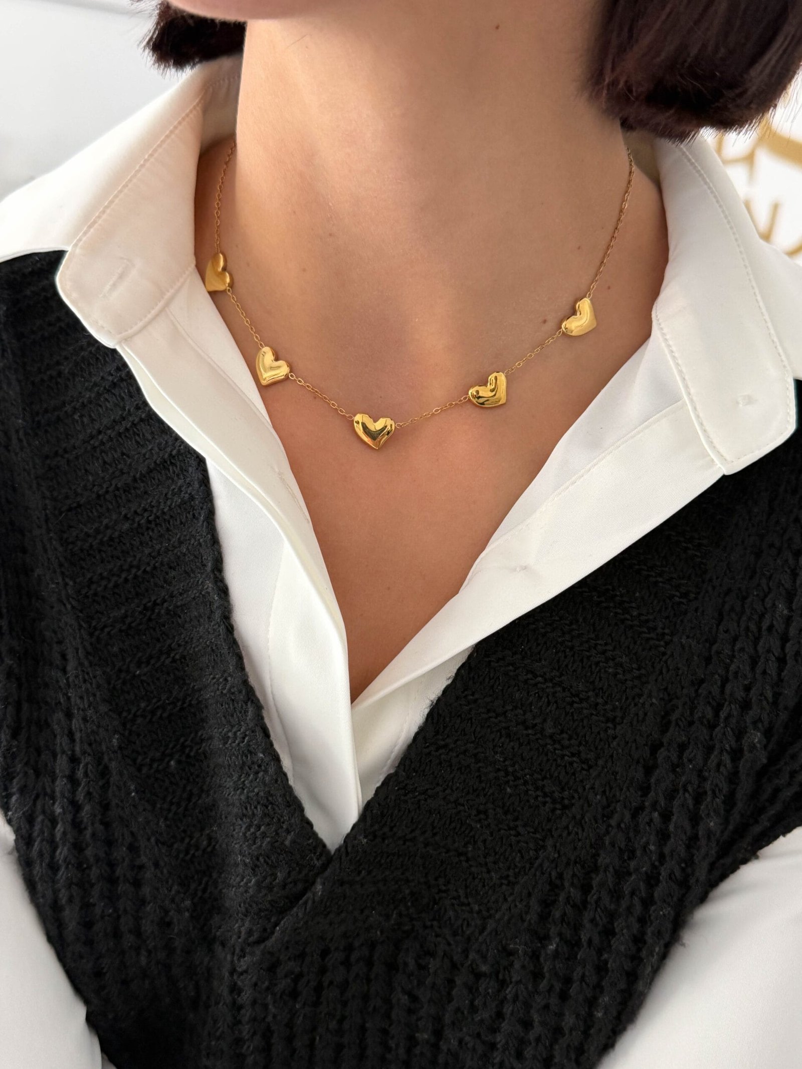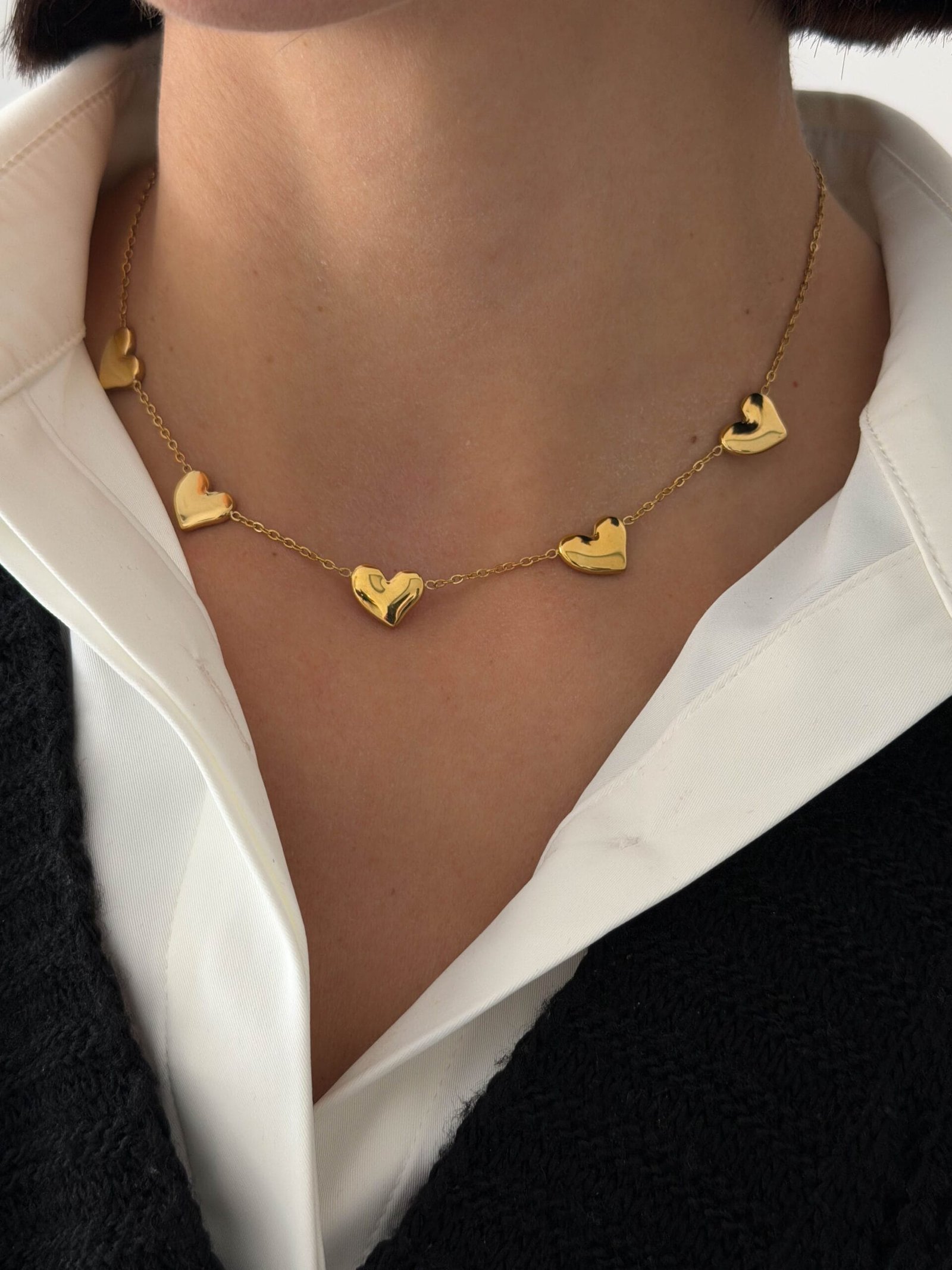 Ρομαντικό κολιέ με διακριτικές καρδιές, που απλώνονται αρμονικά κατά μήκος της αλυσίδας και χαρίζουν μια κομψή, θηλυκή λάμψη. Ένα minimal αλλά ιδιαίτερο σχέδιο, ιδανικό για καθημερινές εμφανίσεις αλλά και για layering με άλλα κολιέ.