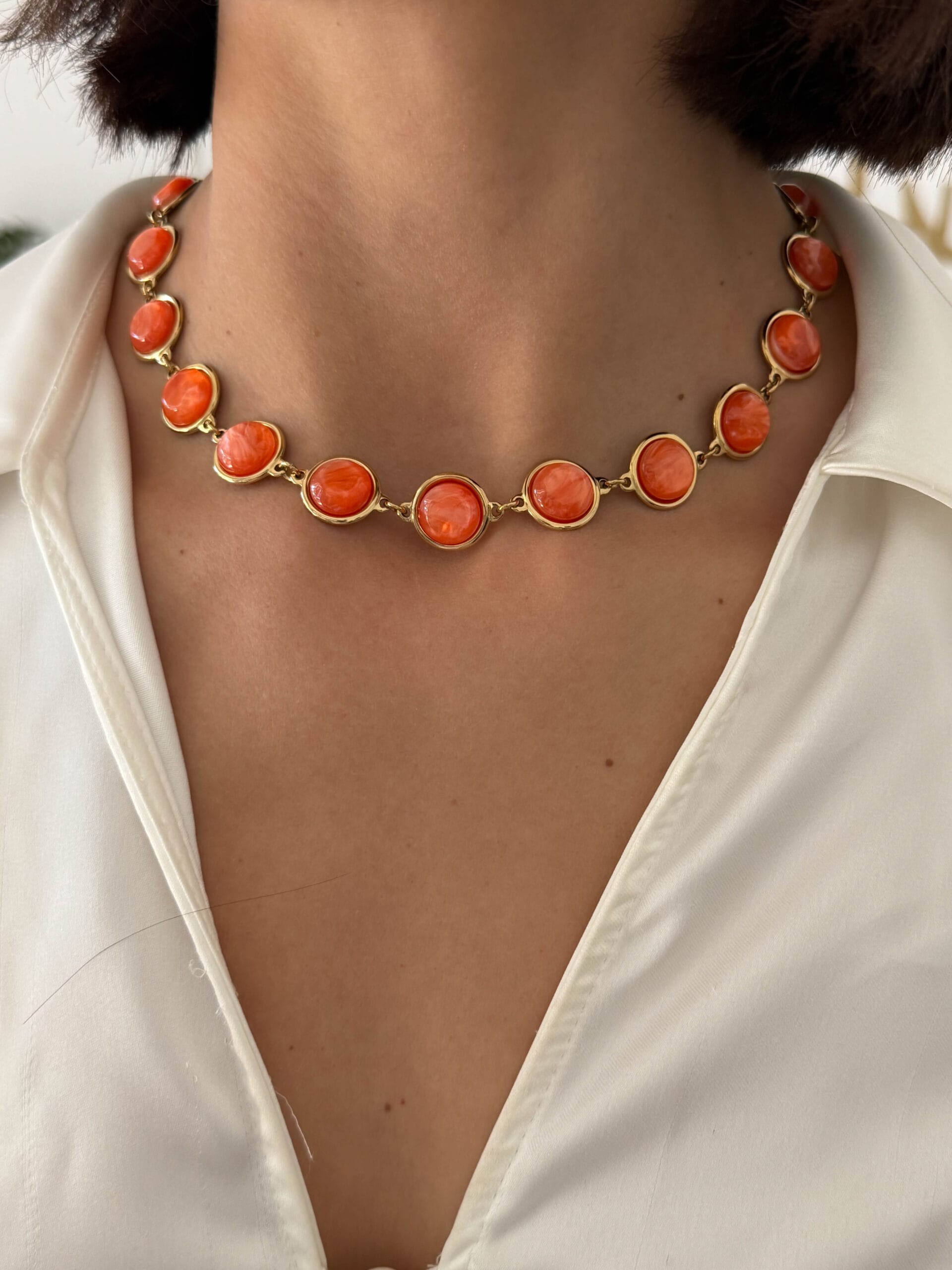 Κολιέ από ανοξείδωτο ατσάλι σε χρυσό τόνο με οβάλ κοραλλί πέτρες. Ένα κομψό και ανοιξιάτικο-καλοκαιρινό κόσμημα που προσθέτει ζωντάνια και χρώμα σε κάθε εμφάνιση.