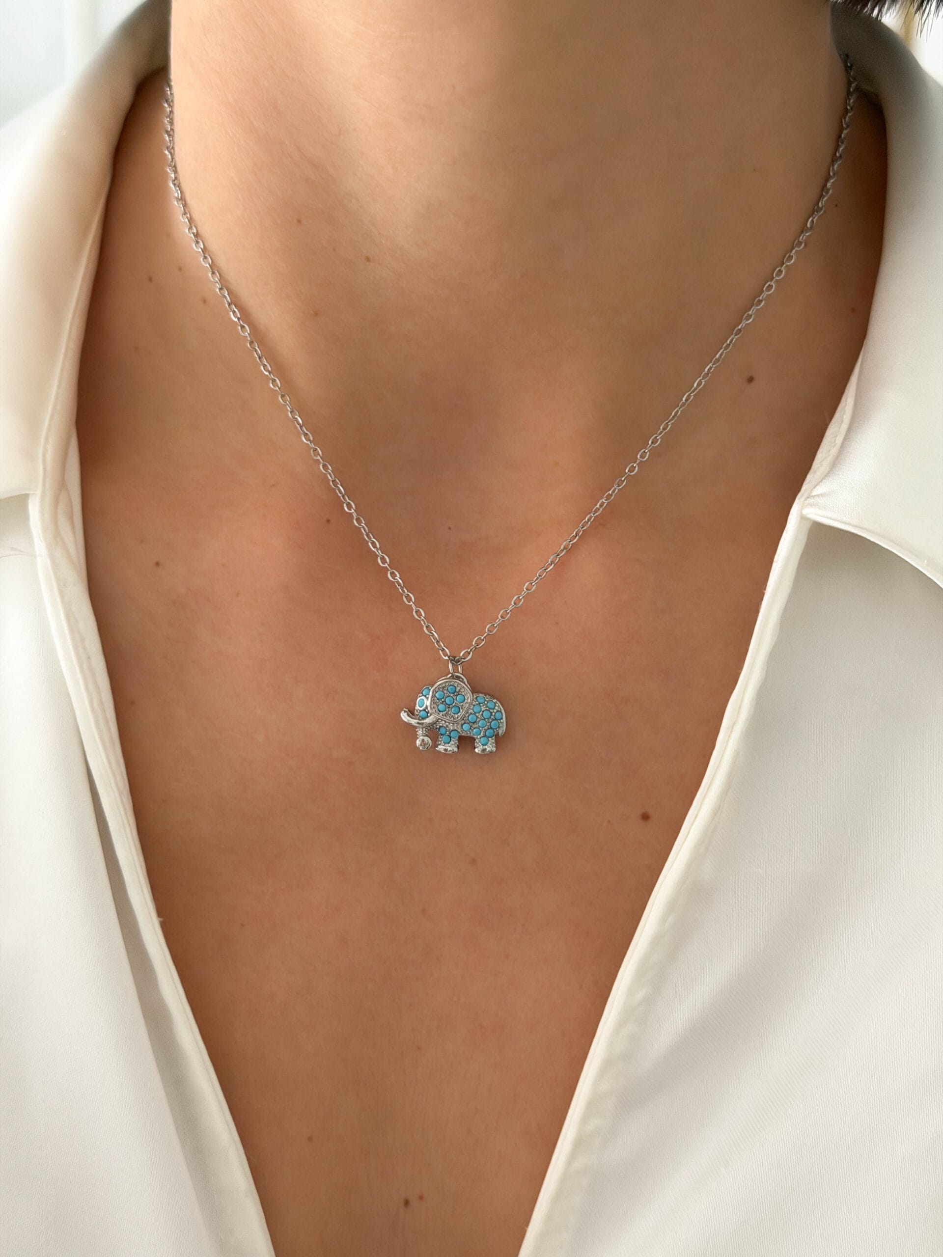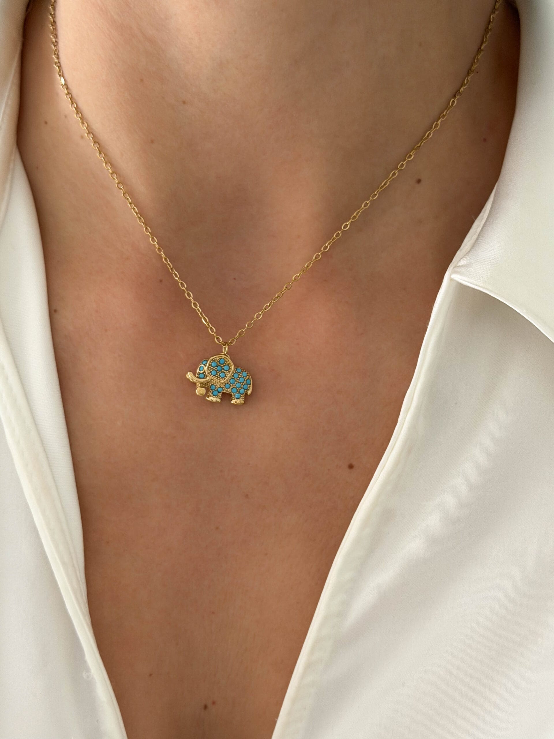 Ένα ξεχωριστό κολιέ με μοτίβο ελεφαντάκι, διακοσμημένο με τιρκουάζ πέτρες που χαρίζουν χρώμα και ιδιαίτερο χαρακτήρα. Το ελεφαντάκι συμβολίζει τύχη, δύναμη και προστασία, κάνοντάς το ιδανικό κόσμημα τόσο για καθημερινή χρήση όσο και για ένα ιδιαίτερο δώρο.