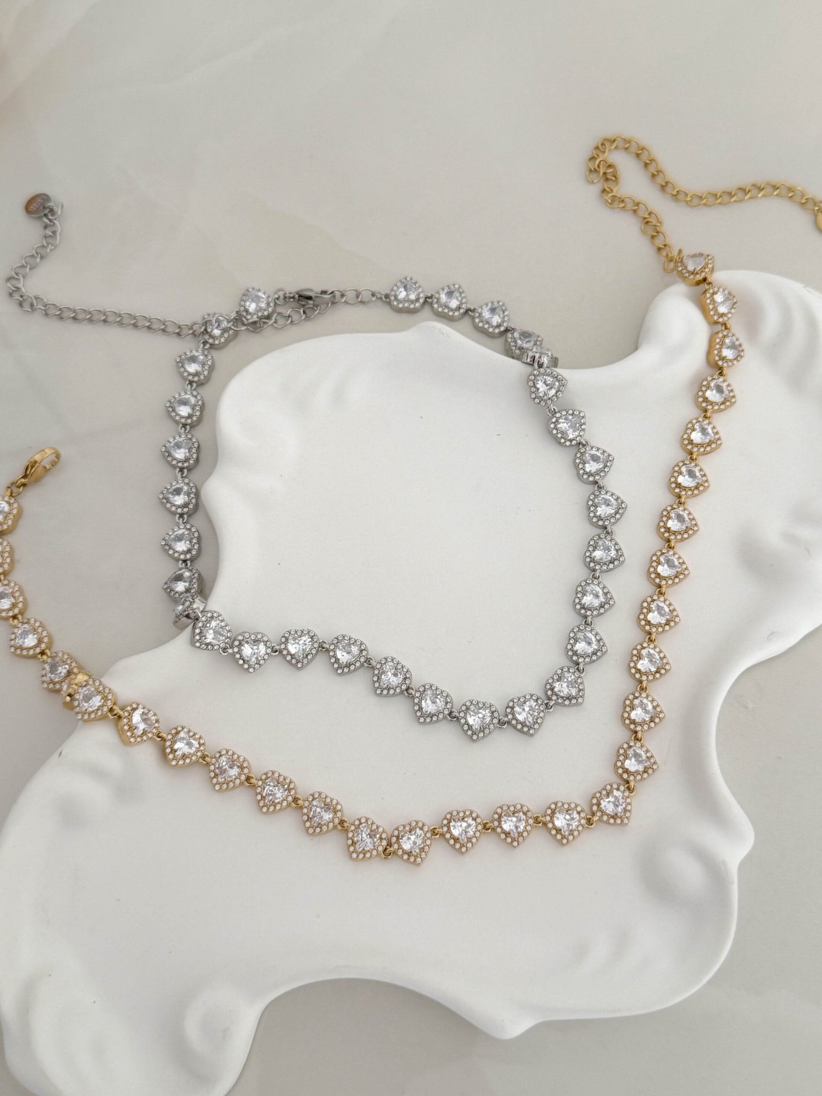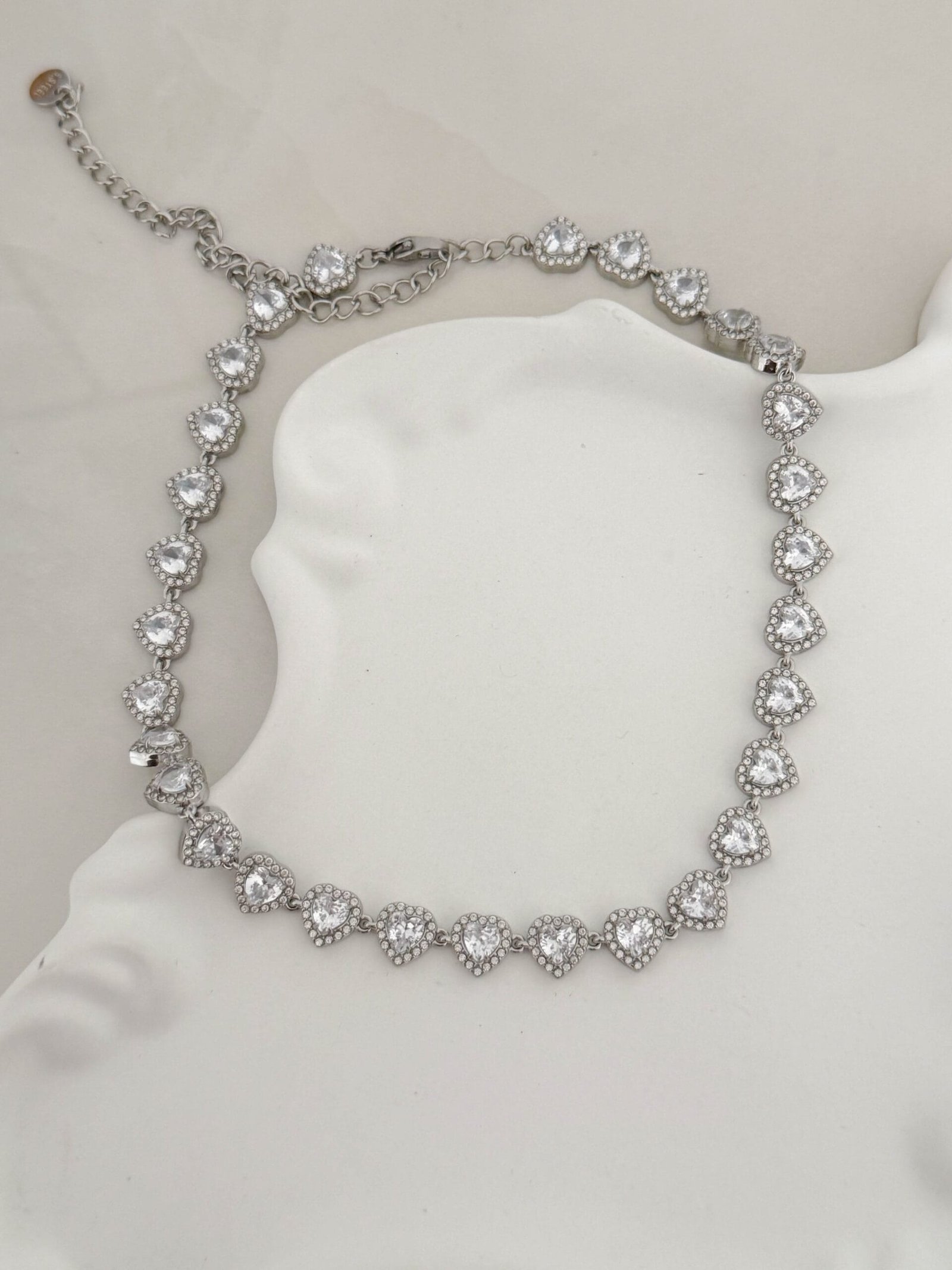 Εντυπωσιακό κολιέ από ανοξείδωτο ατσάλι, διακοσμημένο με καρδιές σε σειρά και λαμπερές πέτρες pavé που χαρίζουν κομψή και διαχρονική λάμψη. Ένα ρομαντικό κόσμημα που φοριέται εύκολα από το πρωί έως το βράδυ και αναδεικνύει κάθε εμφάνιση.