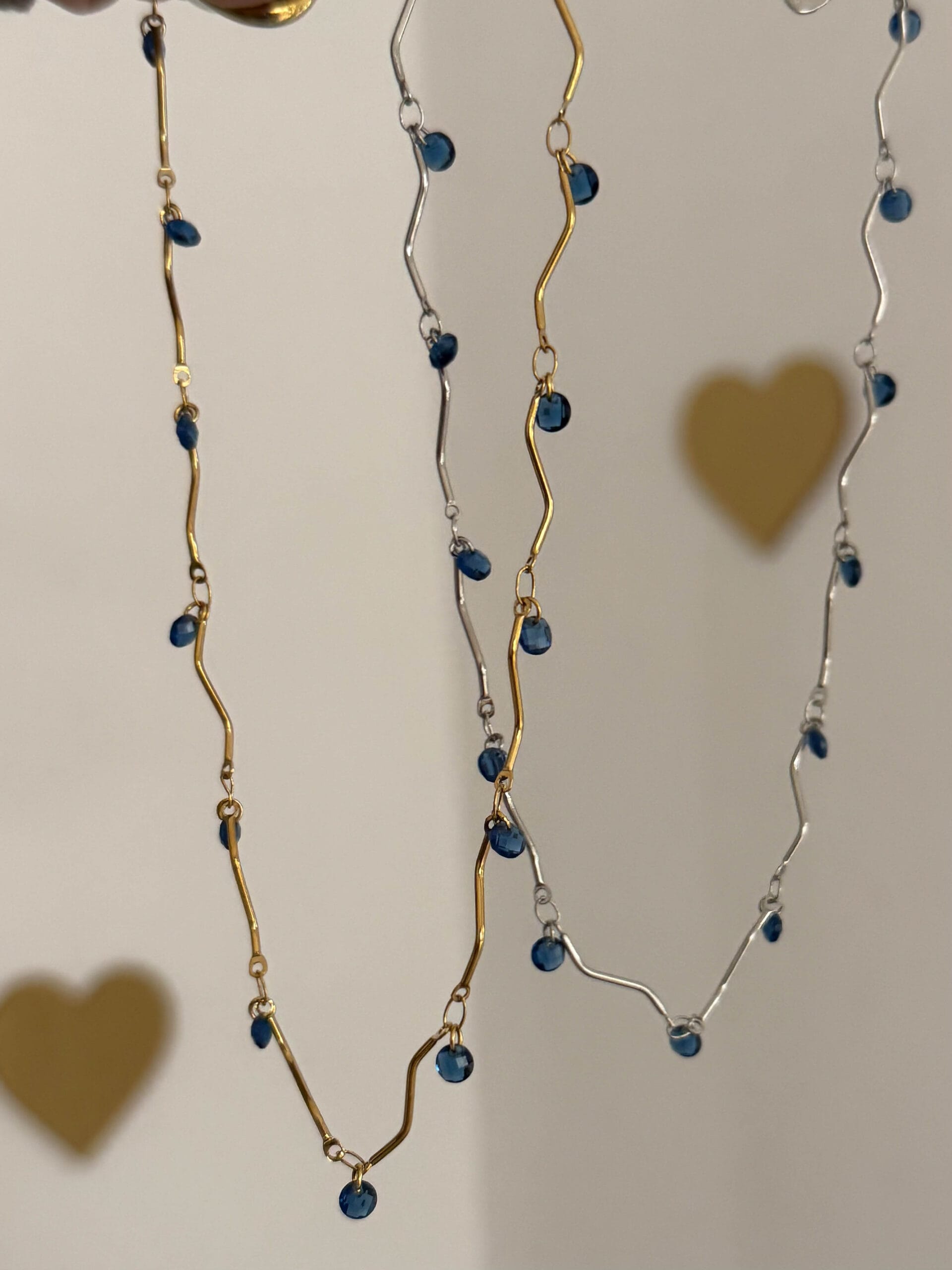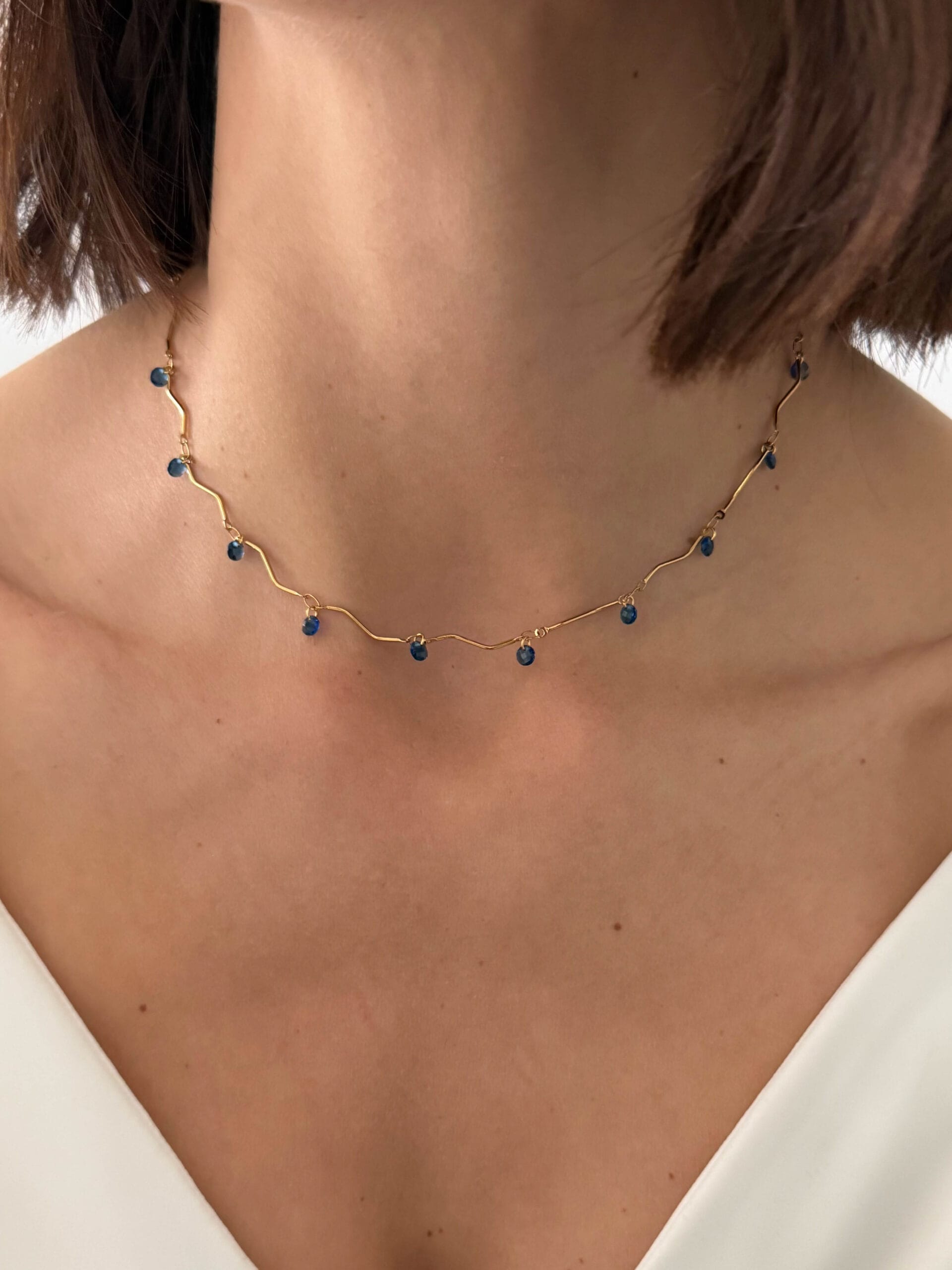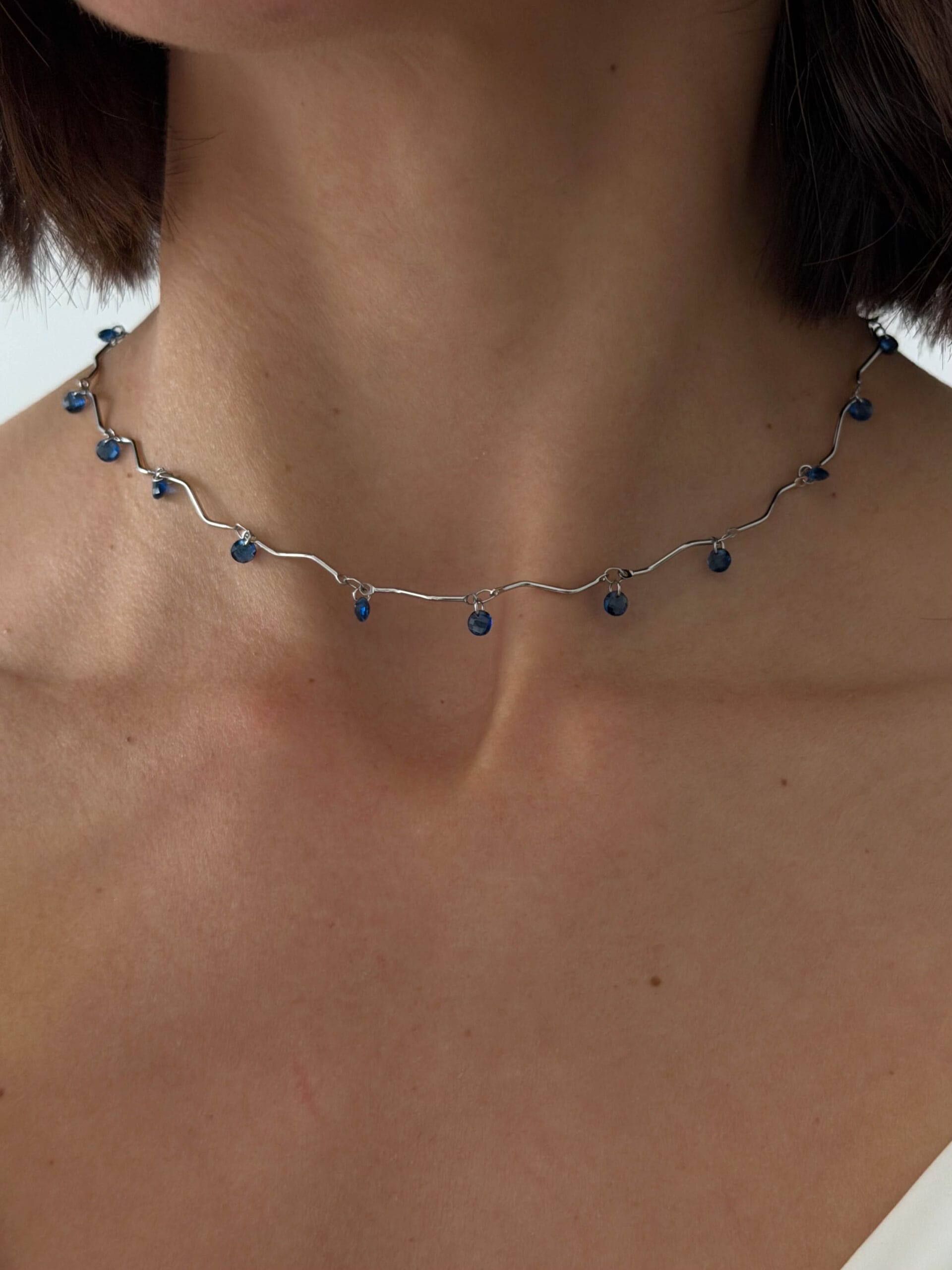Κολιέ από ανοξείδωτο ατσάλι με κυματιστό σχέδιο και μικρά μπλε κρυσταλλάκια. Ένα κομψό και minimal κόσμημα που προσθέτει διακριτική λάμψη και στυλ σε κάθε εμφάνιση. Διατίθεται σε χρυσό και ασημί τόνο.