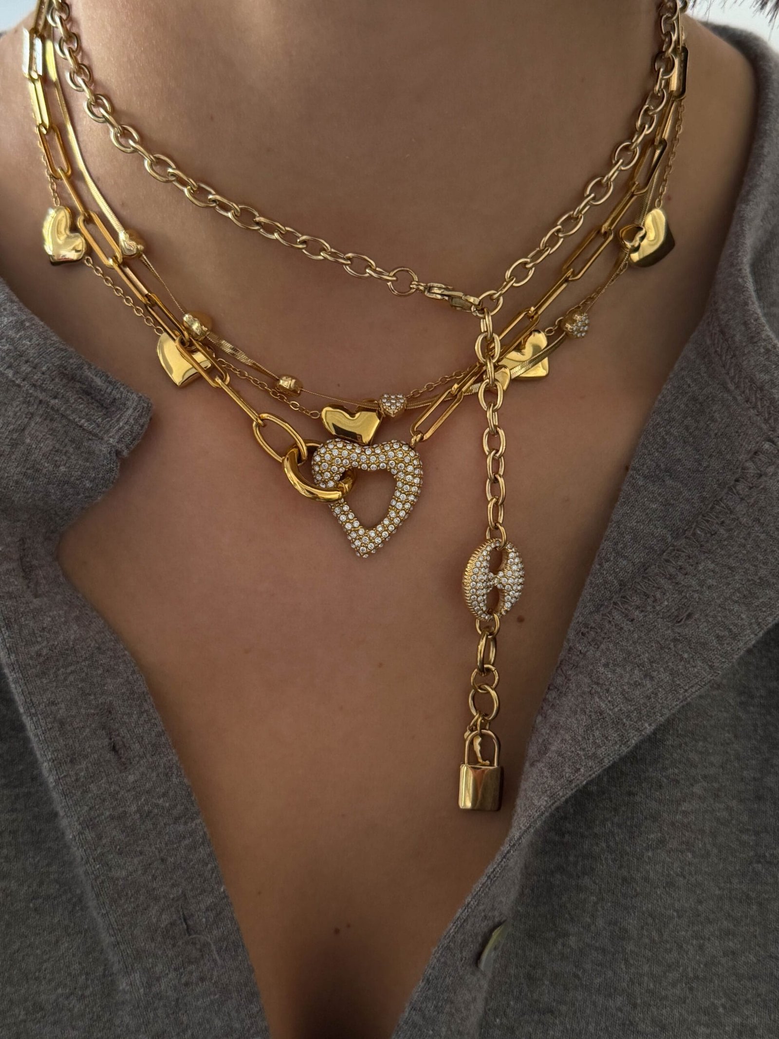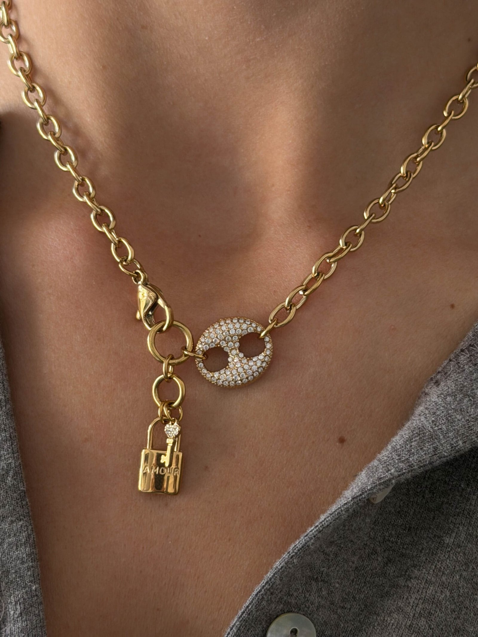 Εντυπωσιακό κολιέ με αλυσίδα τύπου chain και statement κούμπωμα, διακοσμημένο με λαμπερό pavé στοιχείο και κρεμαστό λουκέτο που προσθέτει δυναμικό και σύγχρονο χαρακτήρα. Ένα μοντέρνο κόσμημα που συνδυάζει urban αισθητική με κομψή λάμψη, ιδανικό για να αναβαθμίσει κάθε καθημερινό ή βραδινό look.