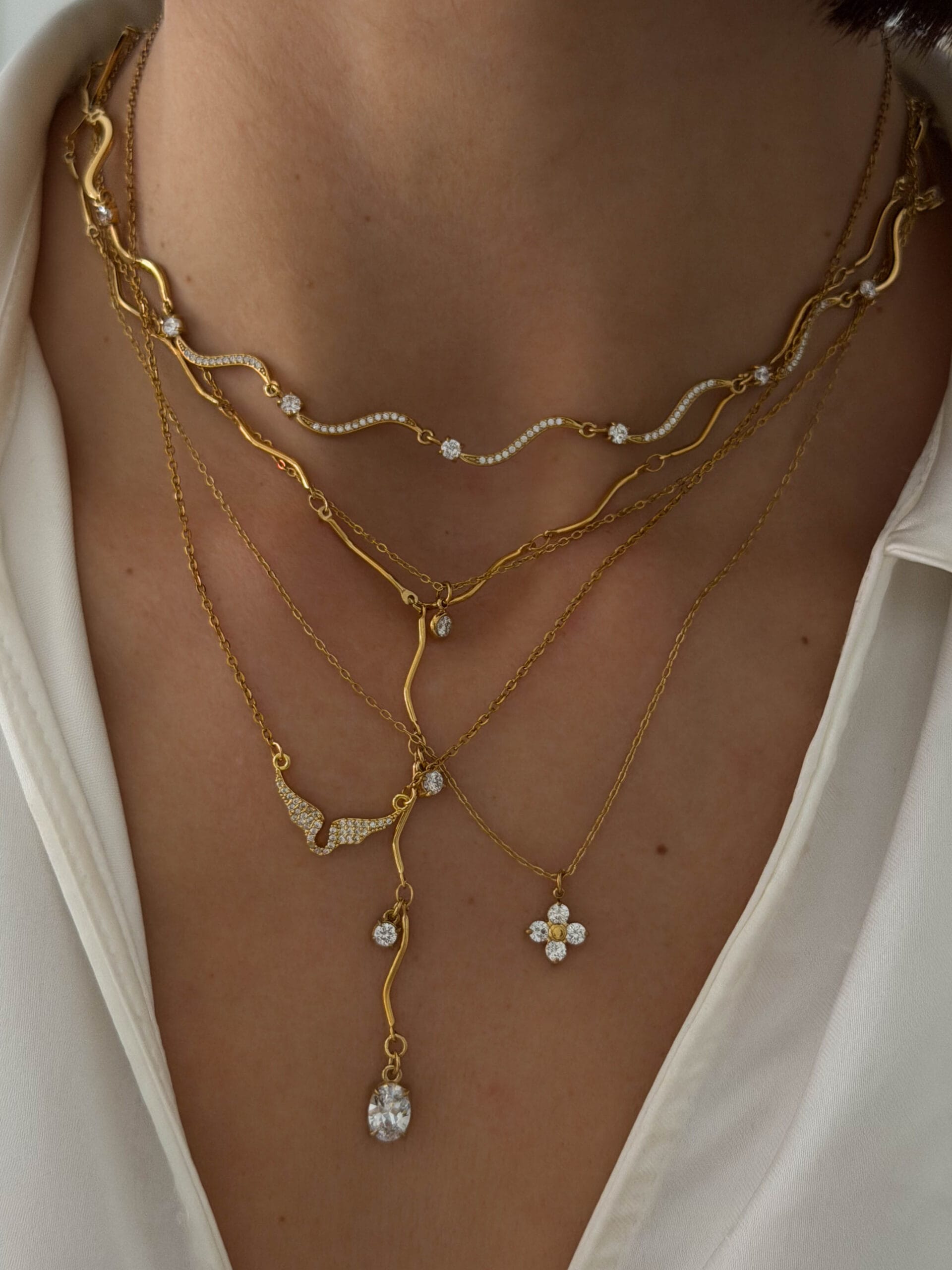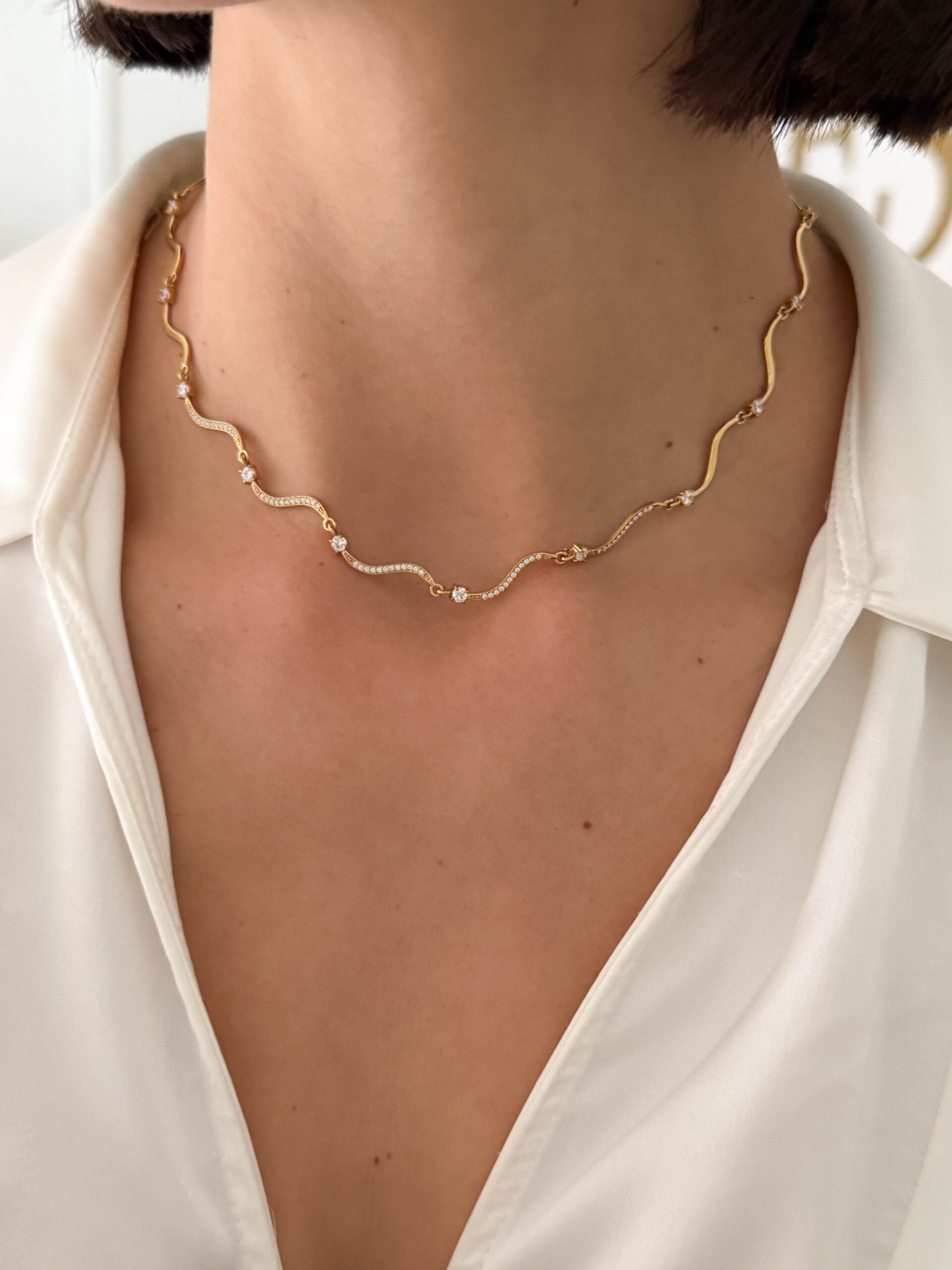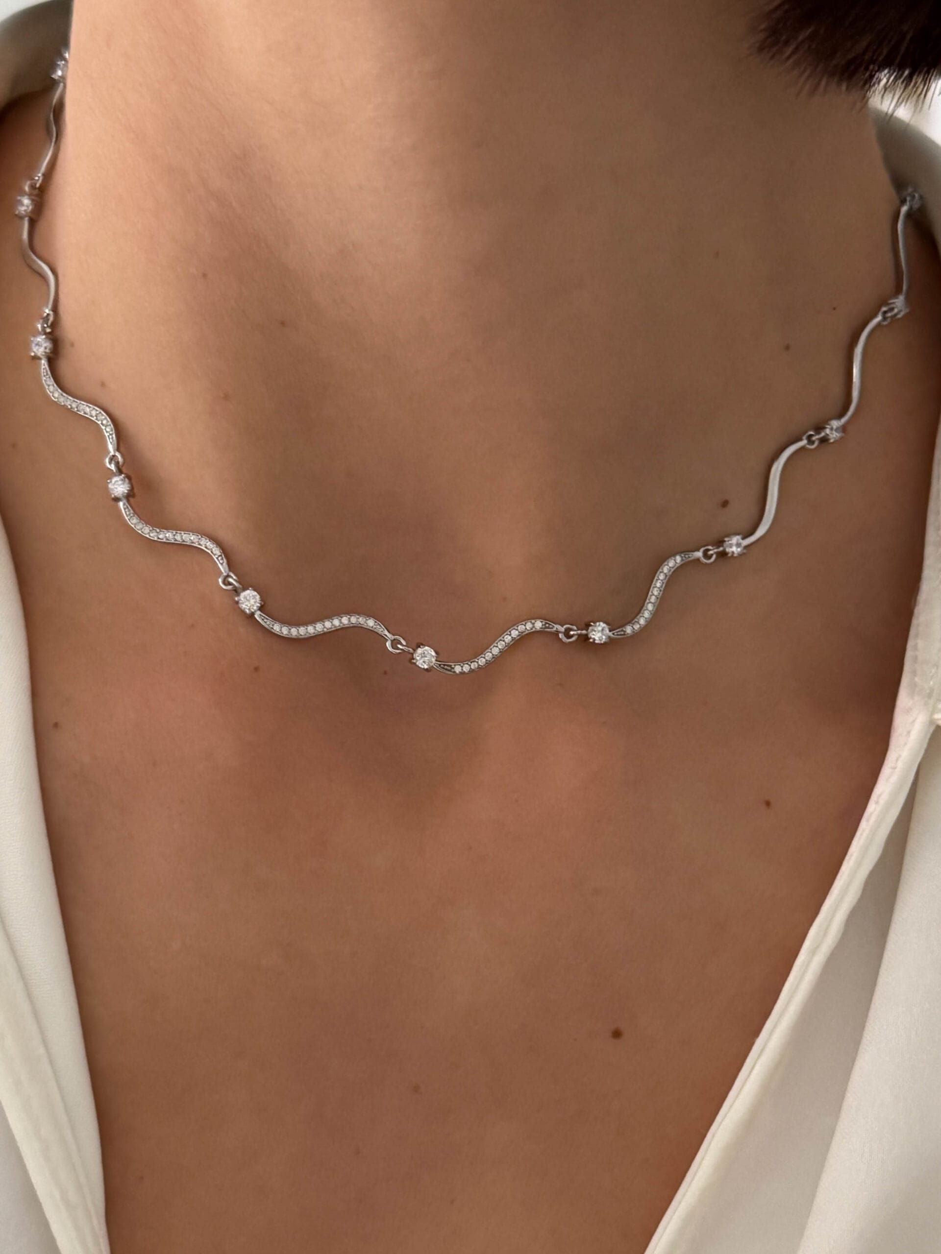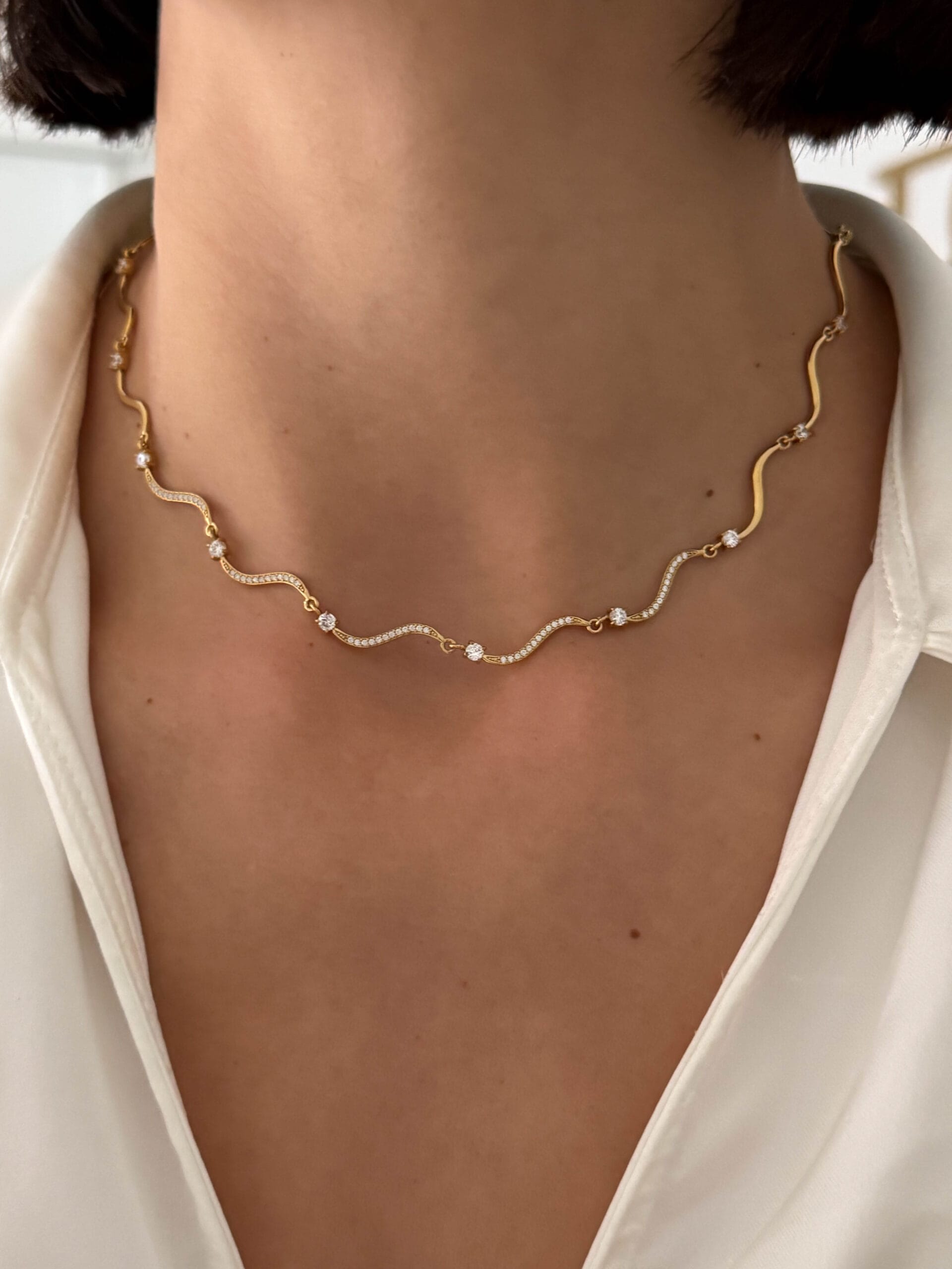 Κομψό κολιέ με κυματιστό σχέδιο και διακριτικές πέτρες ζιργκόν που χαρίζουν λάμψη σε κάθε εμφάνιση.