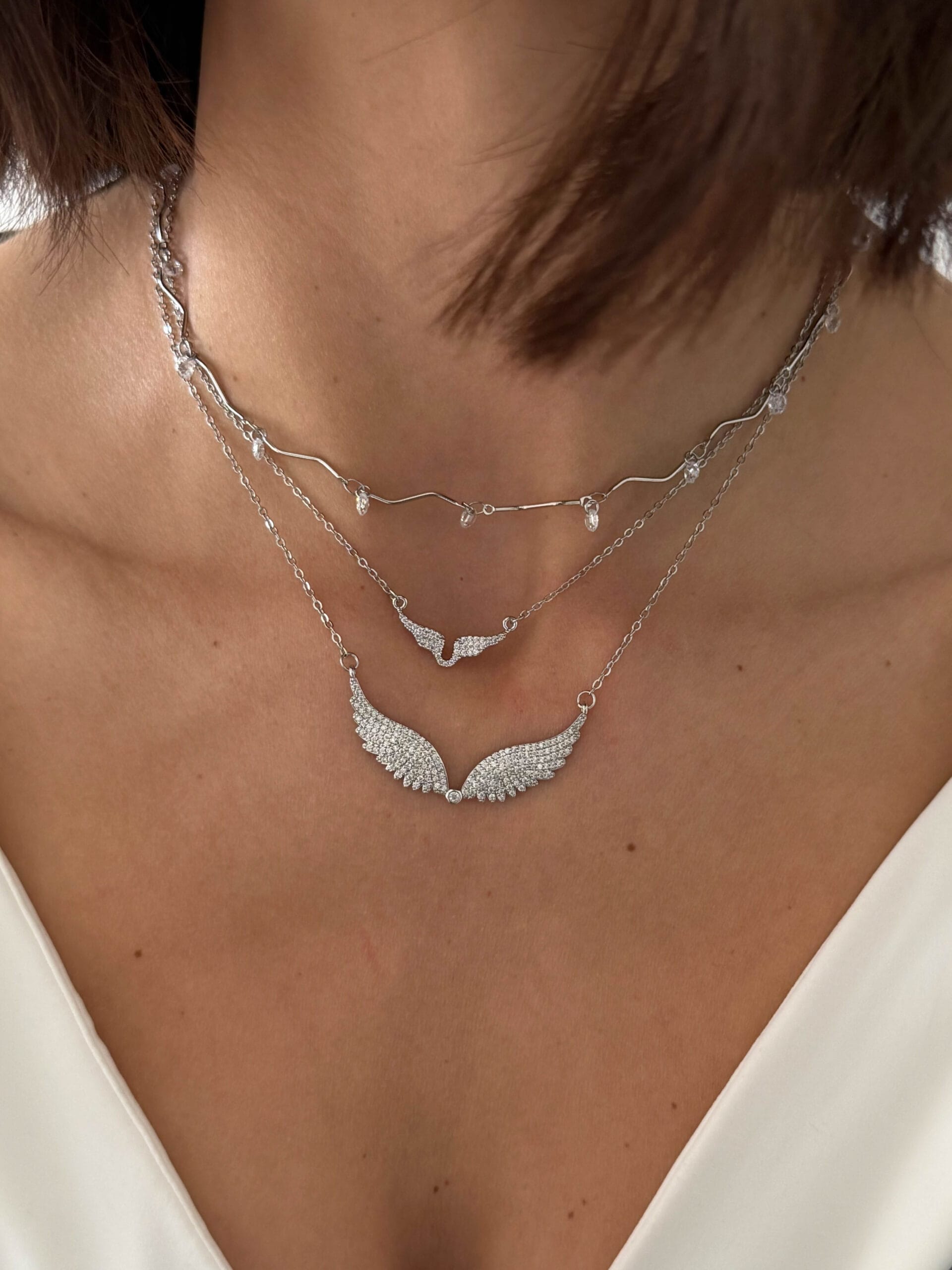 Κολιέ από ανοξείδωτο ατσάλι με κυματιστό σχέδιο και μικρά λευκα κρυσταλλάκια. Ένα κομψό και minimal κόσμημα που προσθέτει διακριτική λάμψη και στυλ σε κάθε εμφάνιση. Διατίθεται σε χρυσό και ασημί τόνο.