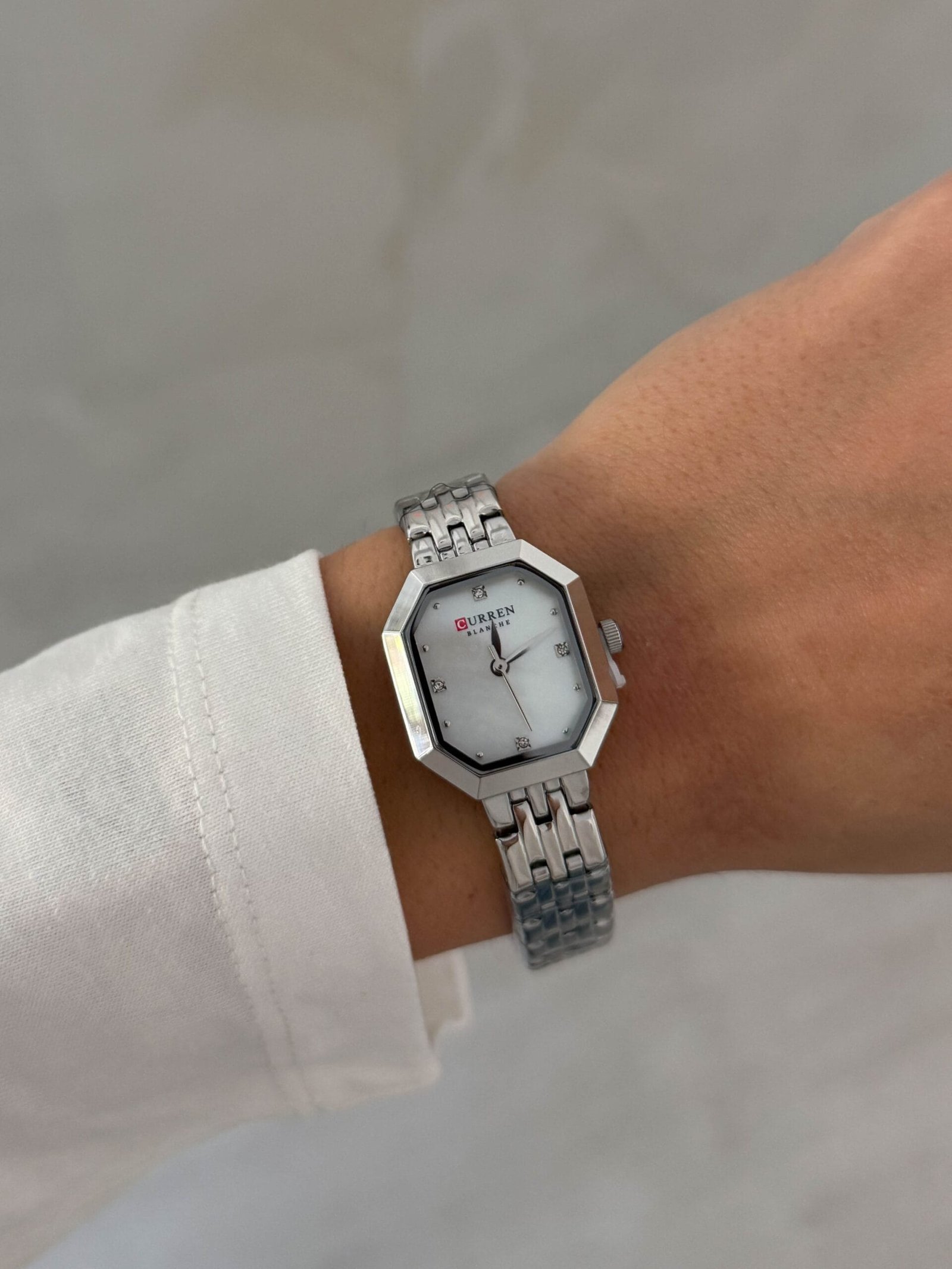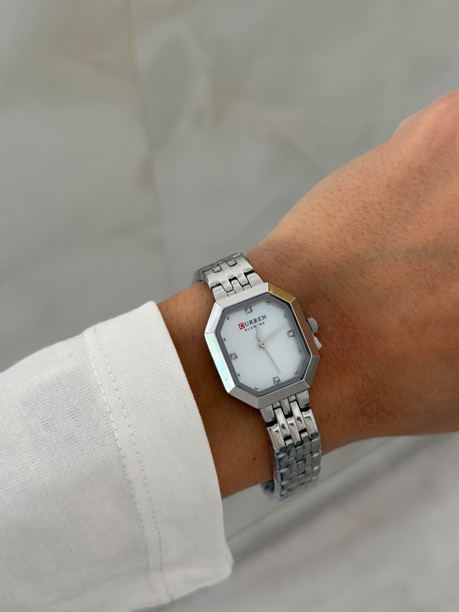 Αυτό το ασημένιο εξαγωνικό ρολόι με το λιτό λευκό καντράν και τις διακριτικές πετρούλες στις ώρες αποπνέει μοντέρνα κομψότητα. Το Silver Hexa είναι φτιαγμένο από ανοξείδωτο ατσάλι, συνδυάζοντας μίνιμαλ αισθητική με μια ξεχωριστή γεωμετρική πινελιά, ιδανικό για κάθε περίσταση.