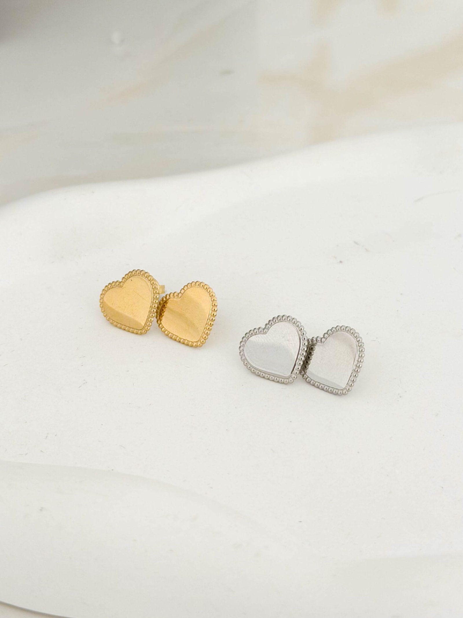 Κομψά καρφωτά σκουλαρίκια σε σχήμα καρδιάς με ανάγλυφο περίγραμμα από μικρές λεπτομέρειες που χαρίζουν διακριτική λάμψη. Minimal και ρομαντικό σχέδιο, ιδανικό για καθημερινές αλλά και πιο elegant εμφανίσεις. Διατίθεται σε χρυσό και ασημί τόνο.