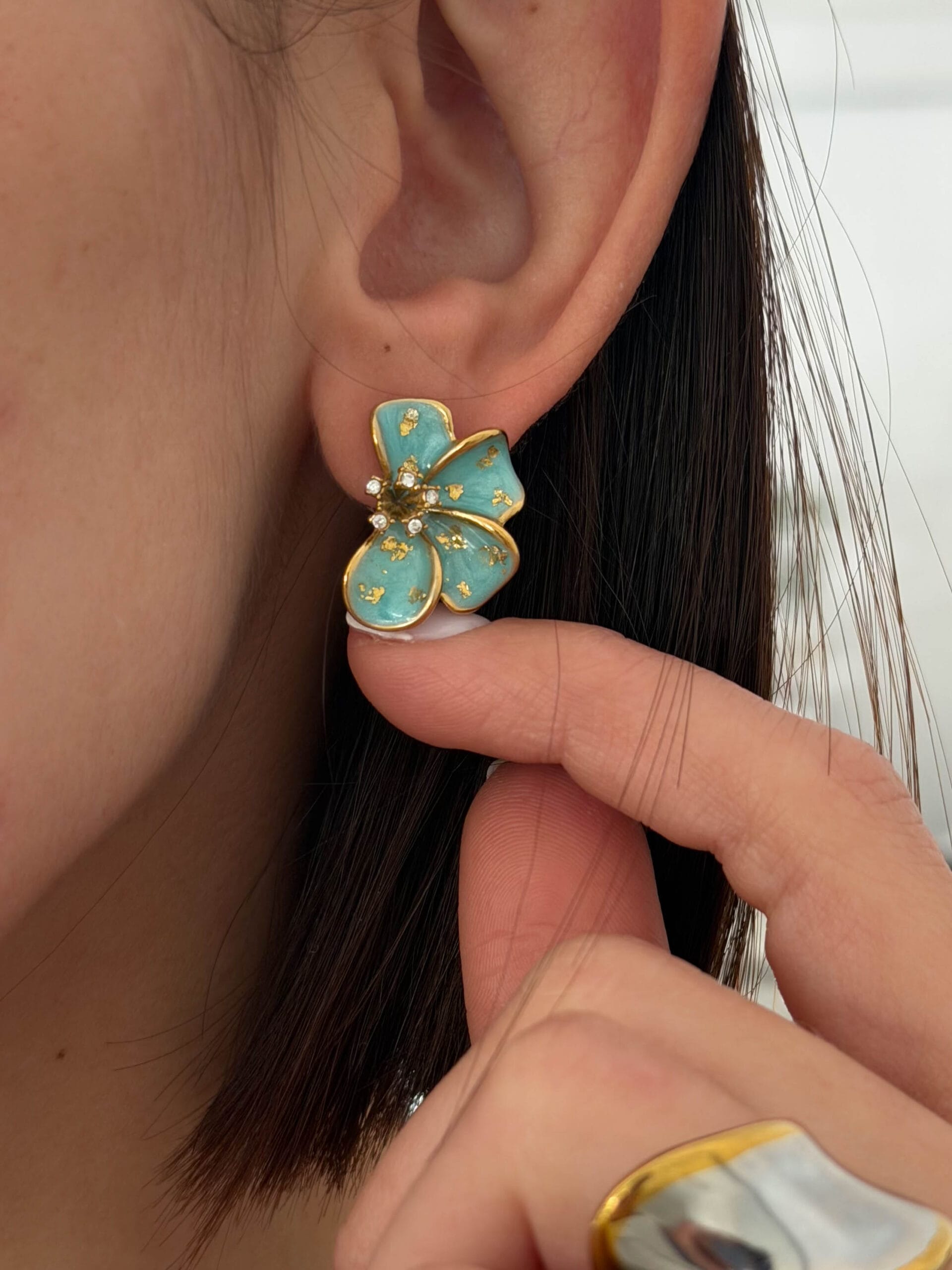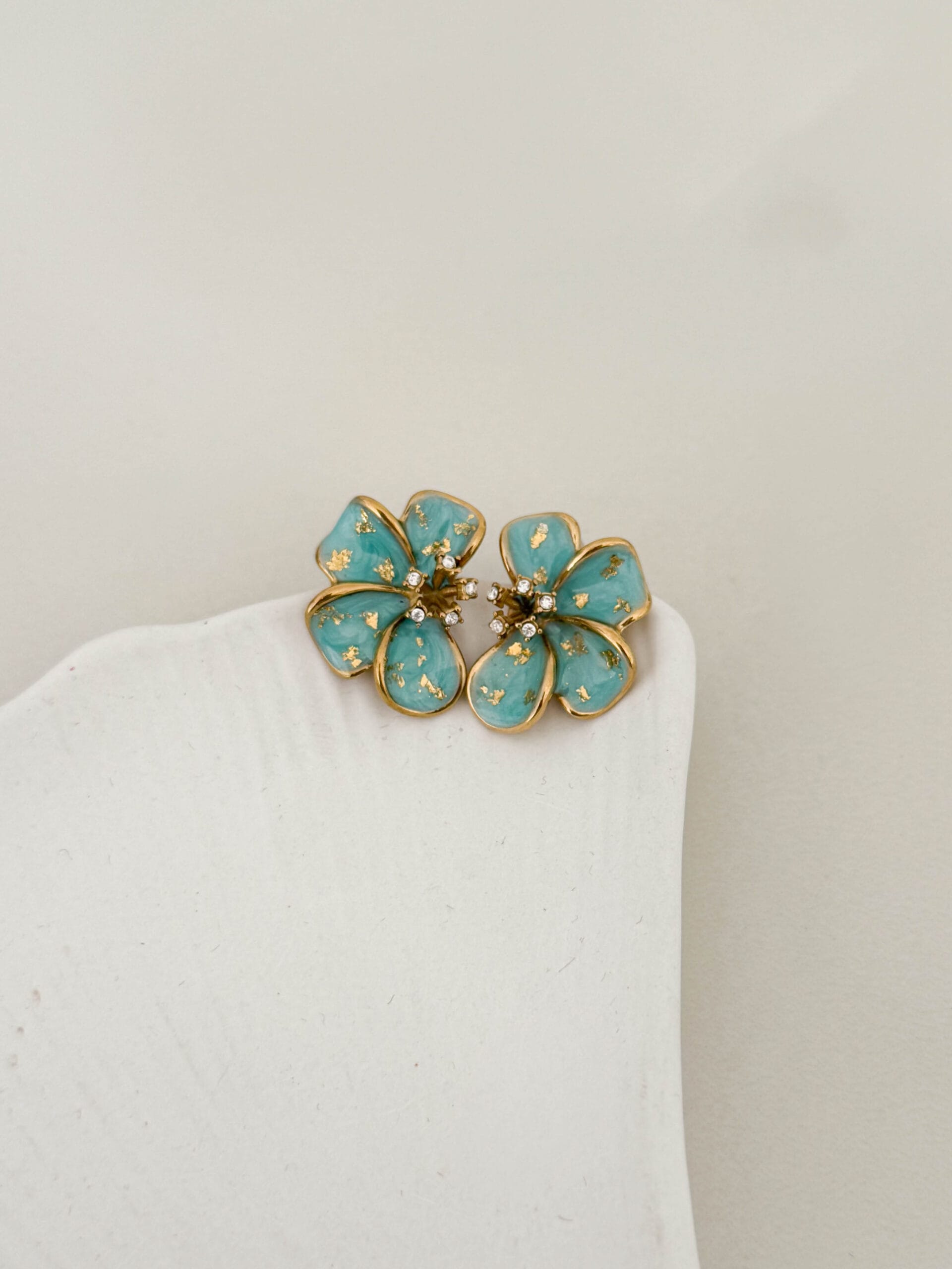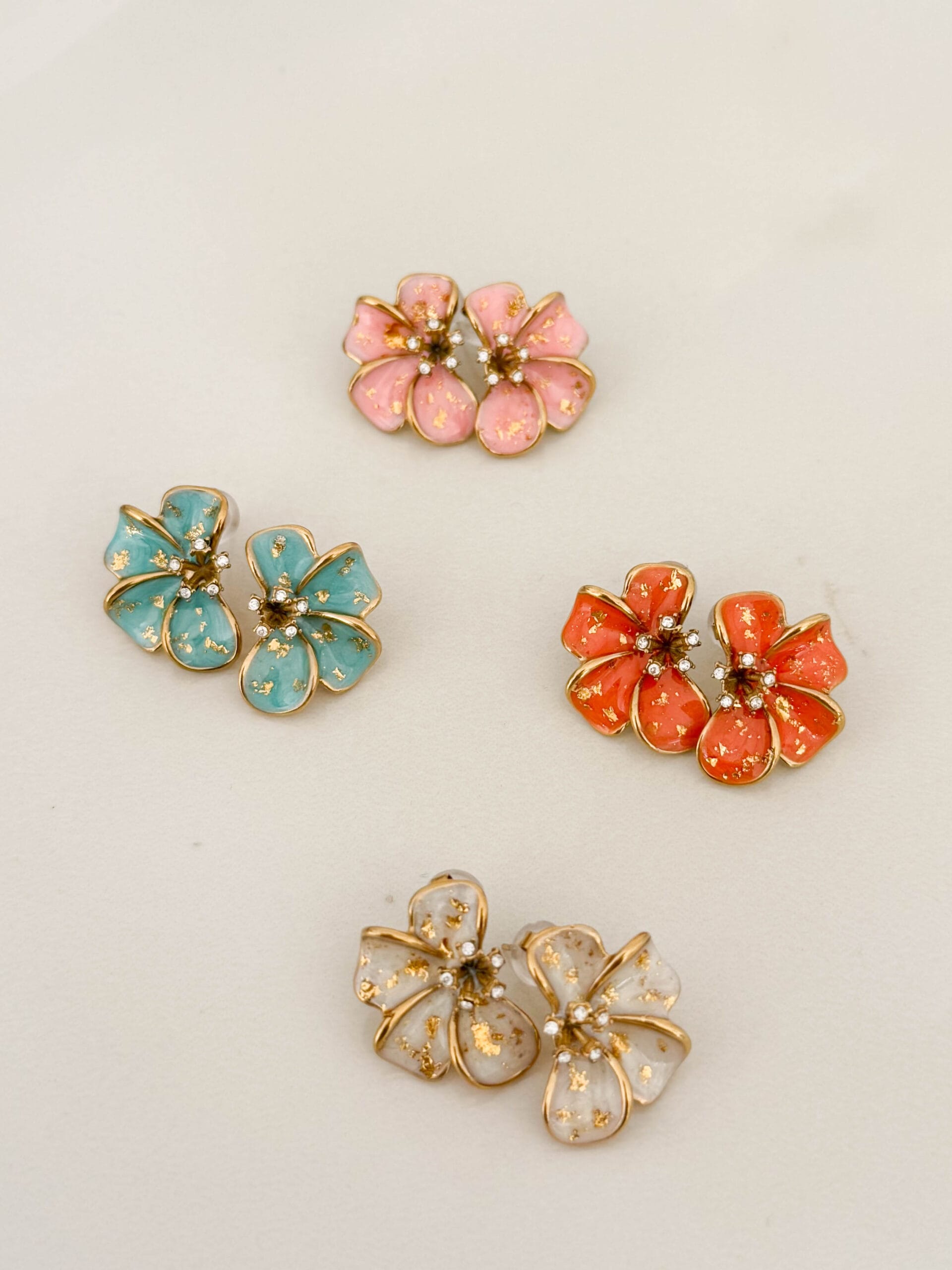Σκουλαρίκια από ανοξείδωτο ατσάλι σε χρυσό τόνο με σχέδιο λουλουδιού και χρωματιστό σμάλτο. Ένα ρομαντικό και ανοιξιάτικο κόσμημα που προσθέτει χρώμα και φρεσκάδα σε κάθε εμφάνιση. Διατίθεται σε διαφορετικές αποχρώσεις.
