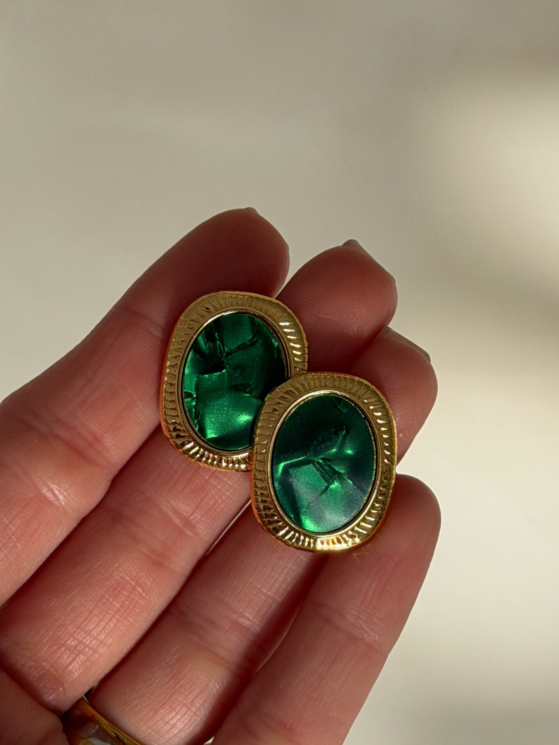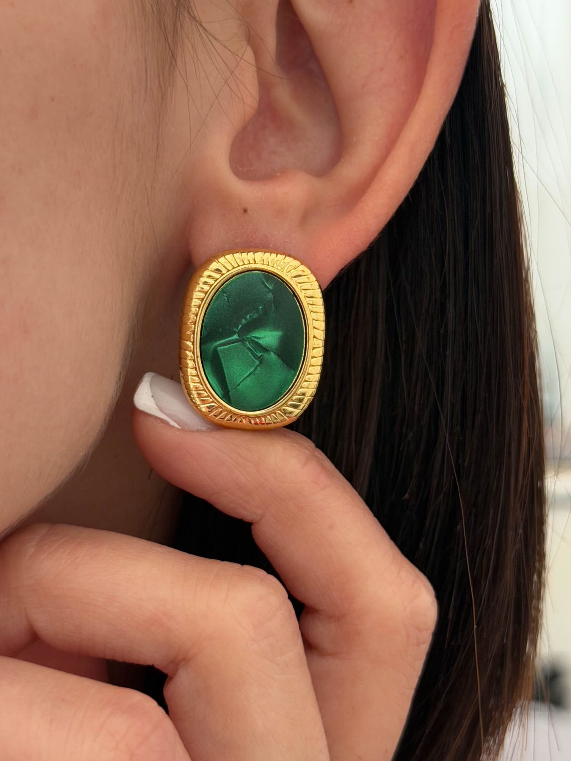 Κομψά σκουλαρίκια με οβάλ πράσινη πέτρα σε έντονη emerald απόχρωση και χρυσό περίγραμμα που χαρίζει ένα διαχρονικό και elegant αποτέλεσμα. Ιδανικά για να προσθέσουν χρώμα και κομψότητα σε κάθε εμφάνιση, από καθημερινά looks μέχρι πιο ιδιαίτερες περιστάσεις.