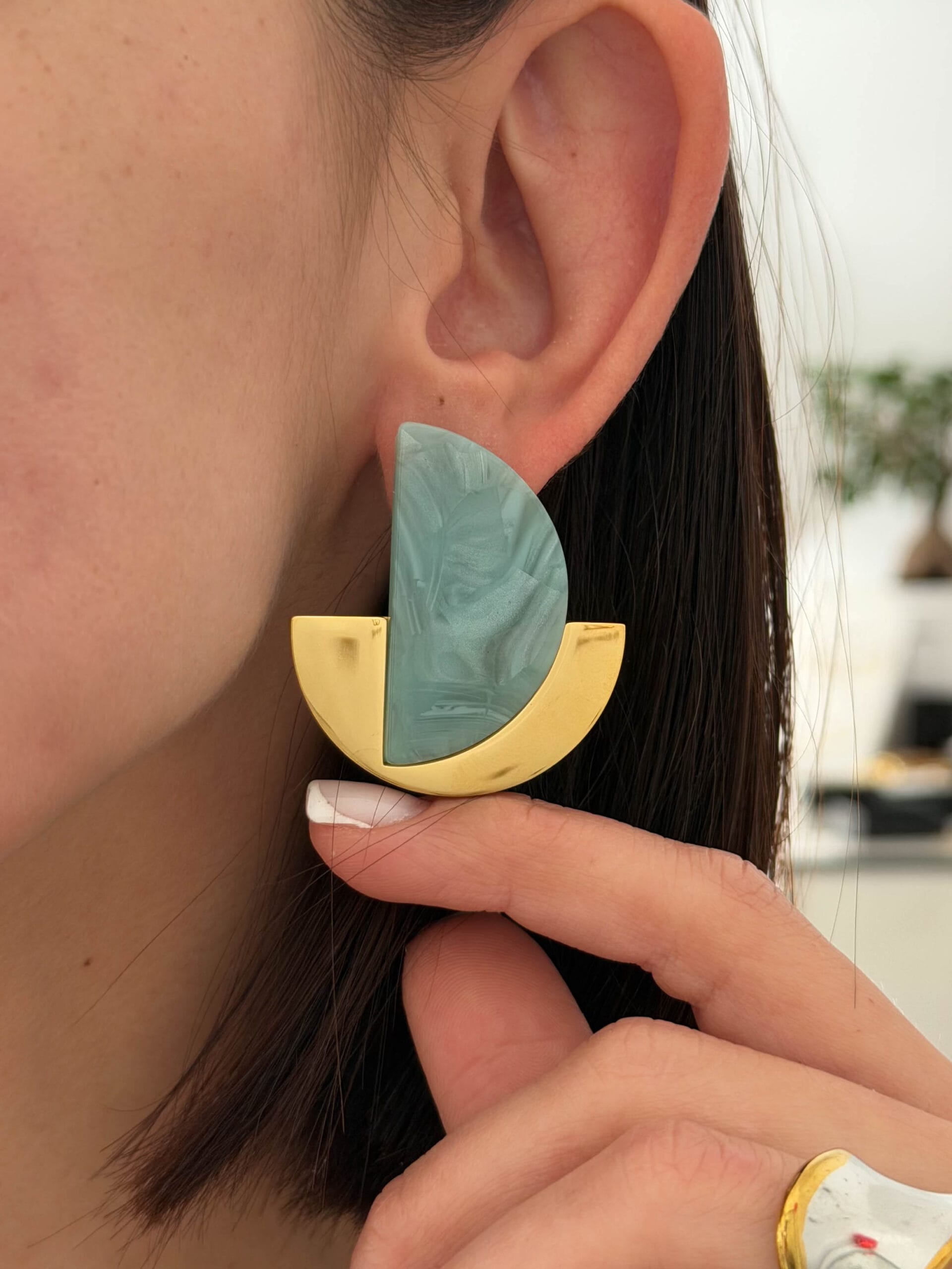 Εντυπωσιακά σκουλαρίκια με μοντέρνο γεωμετρικό σχεδιασμό που συνδυάζει ακρυλικό στοιχείο με χρυσή μεταλλική βάση. Το ιδιαίτερο σχήμα τους δημιουργεί ένα δυναμικό statement κόσμημα που αναβαθμίζει κάθε εμφάνιση, από καθημερινά looks μέχρι πιο fashion σύνολα.