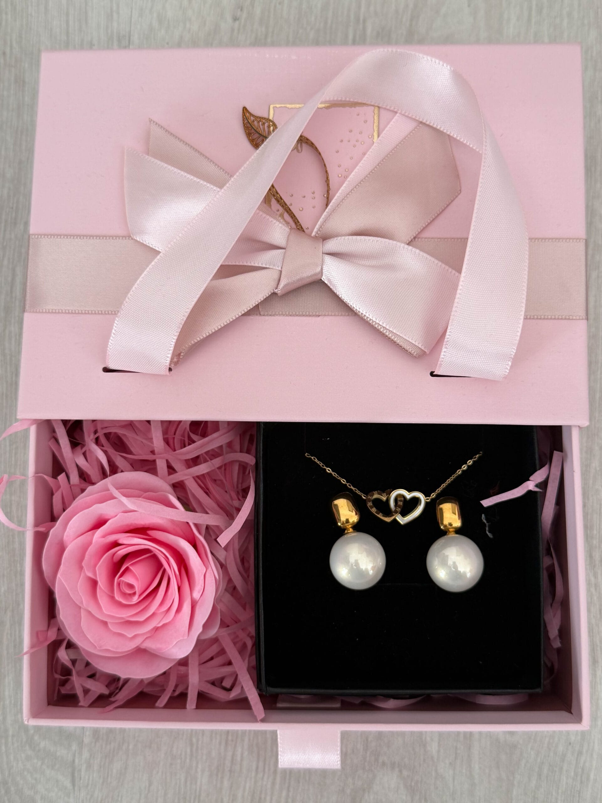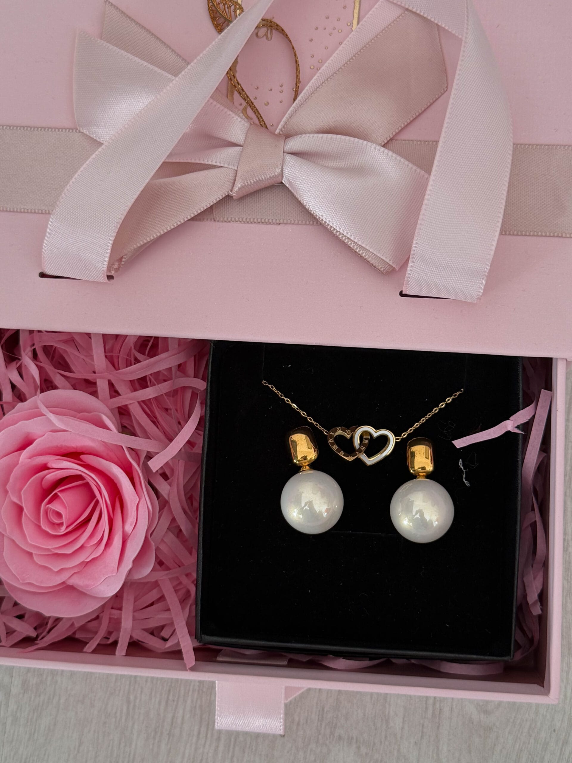 Σε ένα πολυτελές ροζ κουτί με σατέν κορδέλα, θα βρεις ένα όμορφο σετ κοσμημάτων σε χρυσούς τόνους, προσεκτικά τοποθετημένο ώστε να εντυπωσιάζει από την πρώτη στιγμή. Οι ρομαντικές λεπτομέρειες ολοκληρώνουν την εμπειρία και κάνουν το δώρο ακόμη πιο ξεχωριστό.