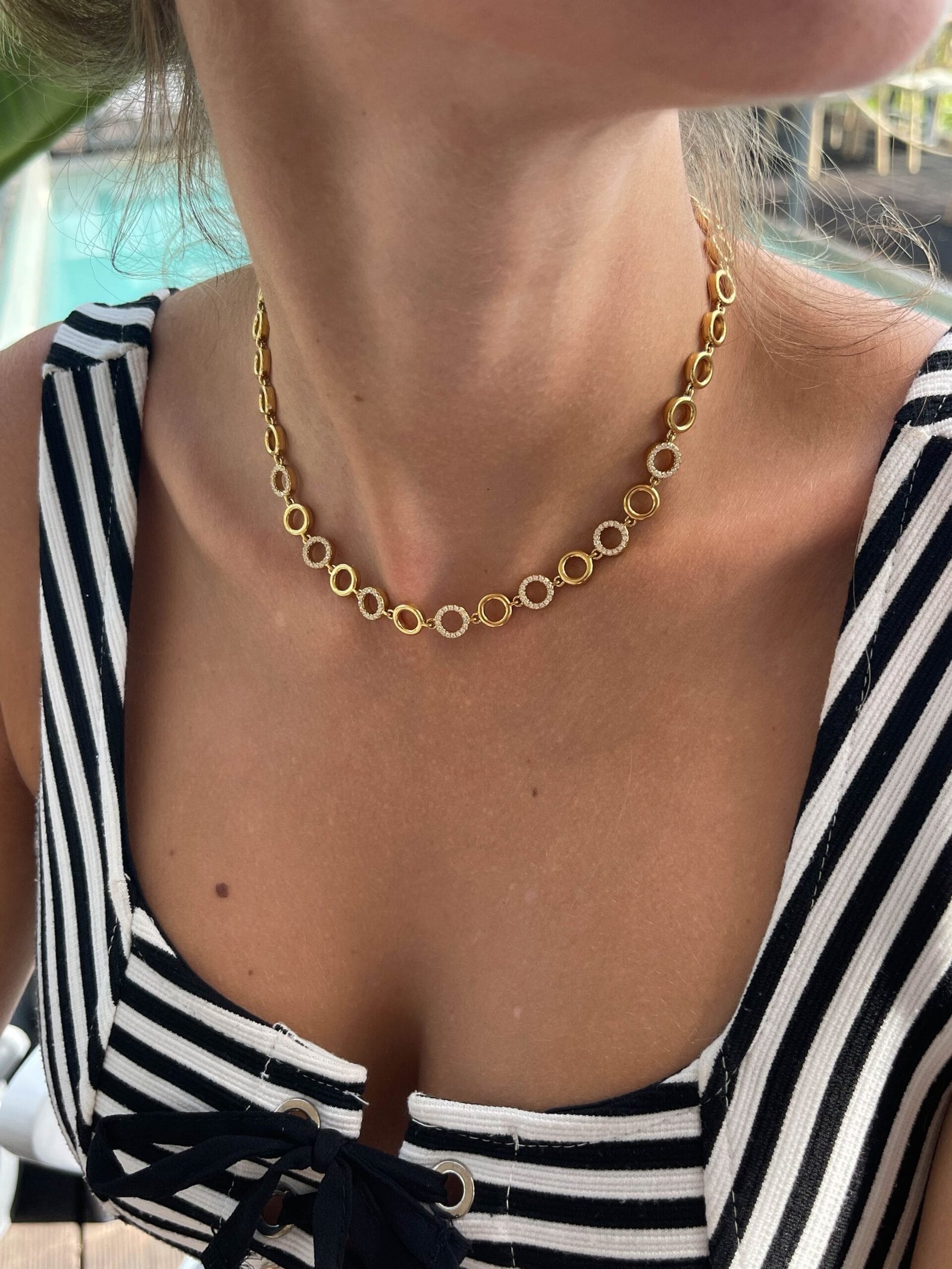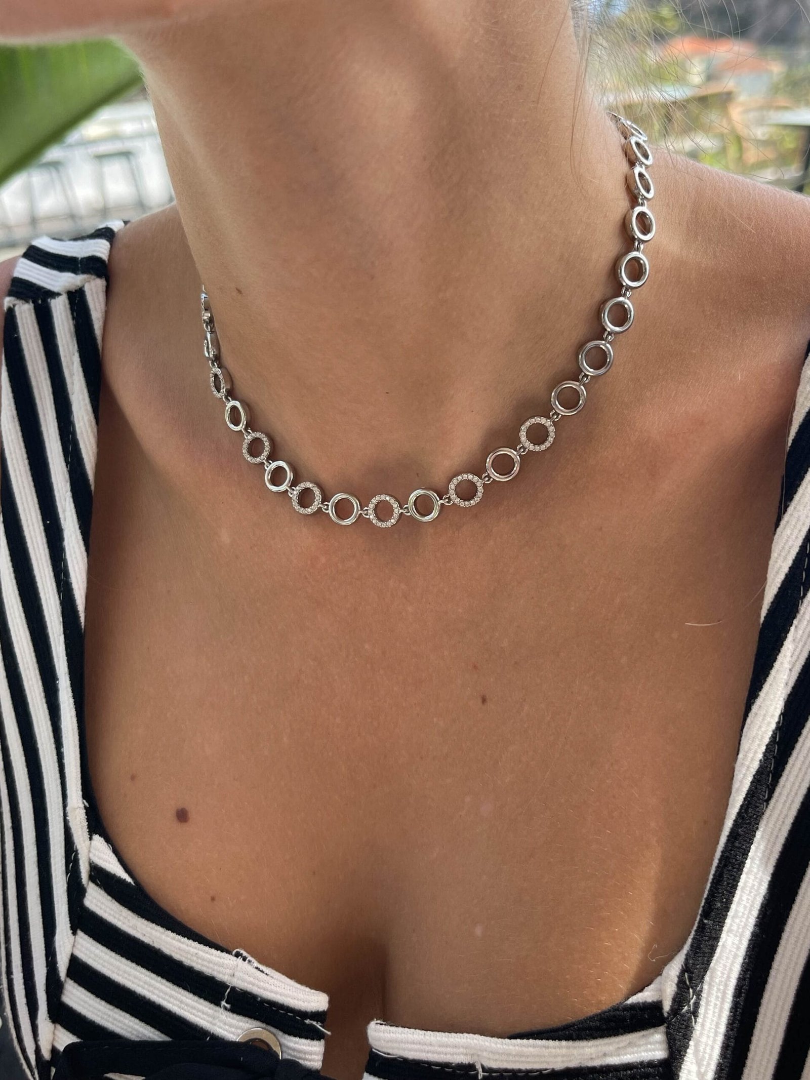 Κομψό κολιέ αλυσίδα με διακριτικά στρογγυλά κρικάκια και λεπτομέρειες από λαμπερά στρας που χαρίζουν μια διακριτική λάμψη. Διαθέσιμο σε δύο χρώματα – κλασικό χρυσό και κομψό ασήμι – ιδανικό για να φορεθεί μόνο του ή να συνδυαστεί με άλλα κολιέ για layered look.
