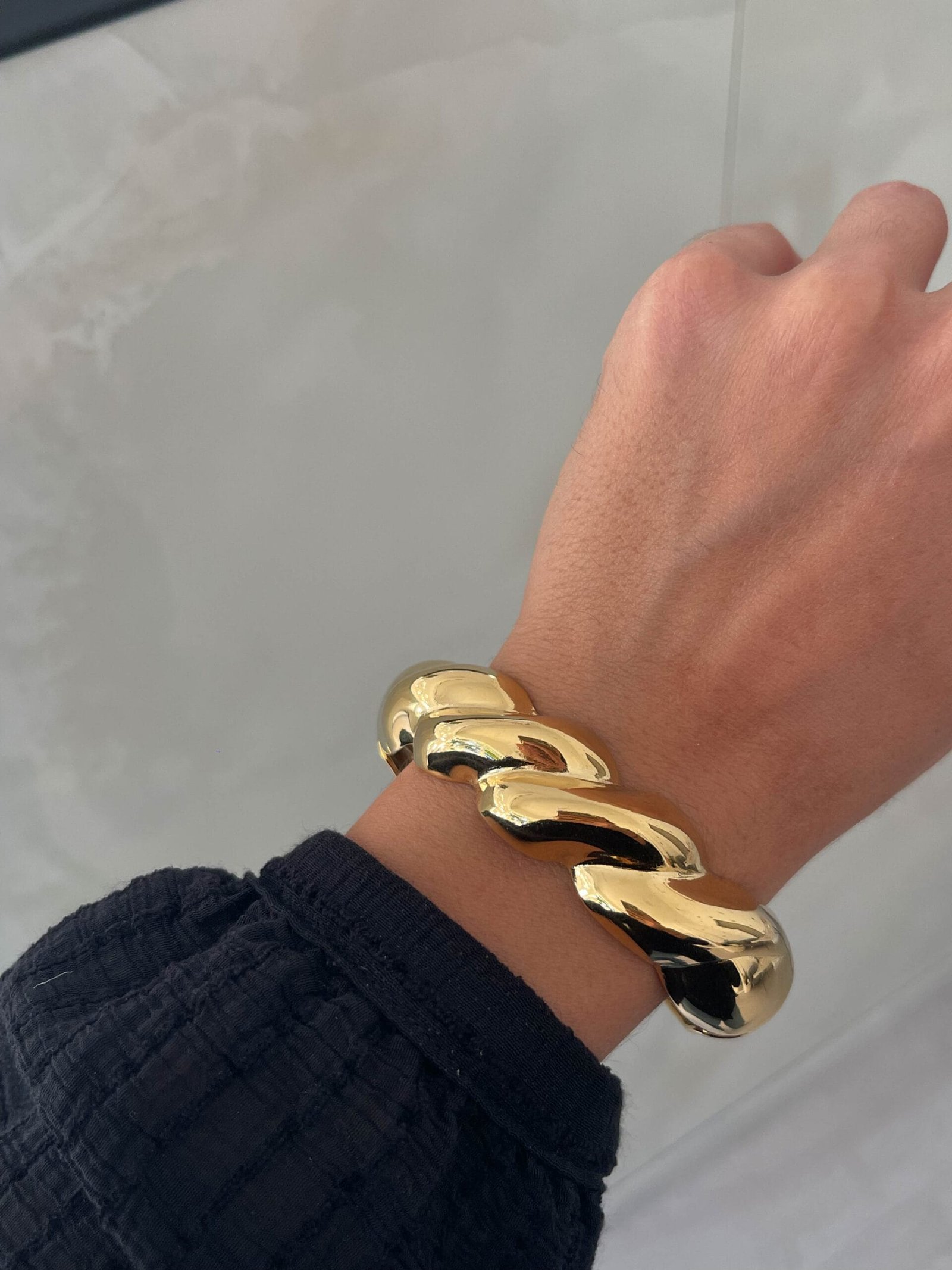 Η χρυσή χειροπέδα “Braid” ξεχωρίζει με το κομψό σχέδιο πλεξούδας, σύμβολο ενότητας, δύναμης και διαχρονικής φινέτσας. Με τη λαμπερή χρυσή της απόχρωση και τη λεπτοδουλεμένη υφή, χαρίζει μια αισθησιακή λάμψη που αναδεικνύει κάθε εμφάνιση — από το πρωί έως το βράδυ.