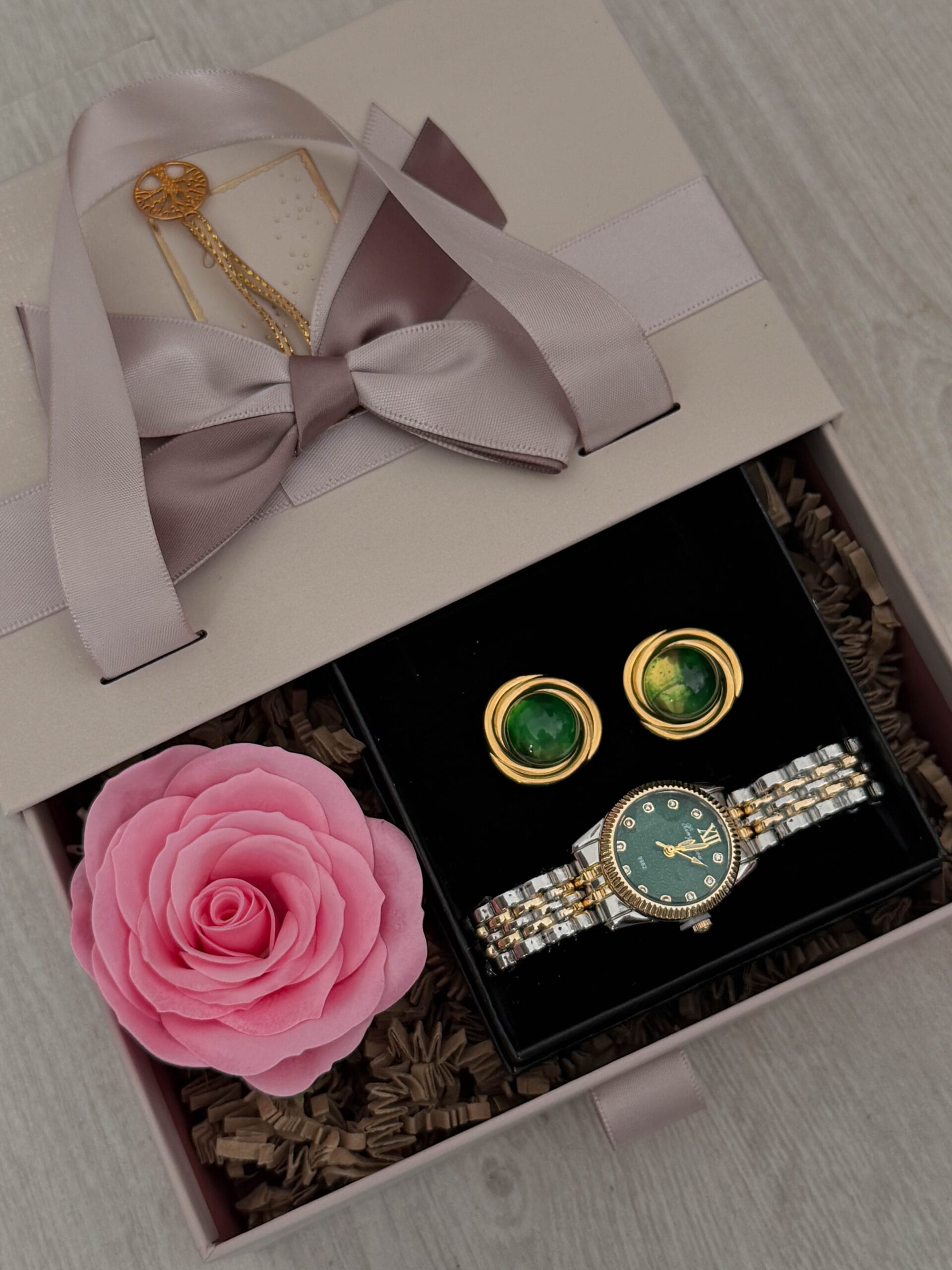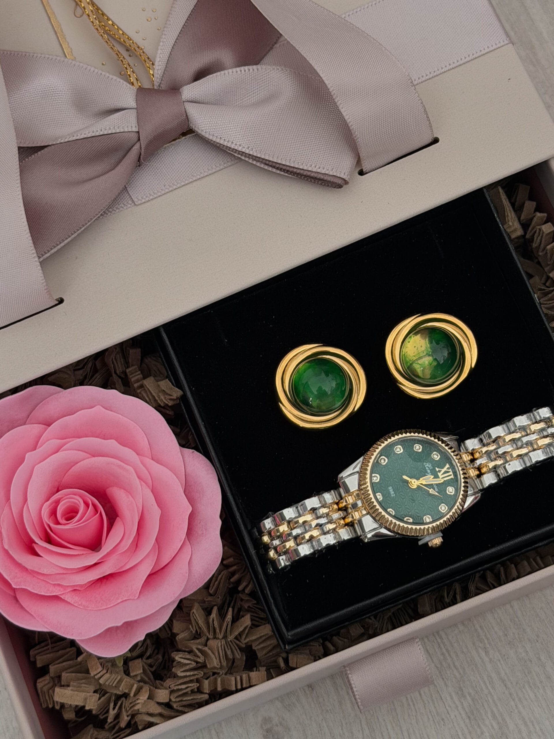 Το κουτί περιλαμβάνει εντυπωσιακά σκουλαρίκια με πράσινη πέτρα σε χρυσή βάση και δίχρωμο γυναικείο ρολόι (χρυσό & ασημί) με πράσινο καντράν, δημιουργώντας ένα αρμονικό και ξεχωριστό σύνολο. Η ένταση του πράσινου χαρίζει χαρακτήρα, ενώ ο συνδυασμός των μετάλλων το κάνει εύκολο να φορεθεί με κάθε κόσμημα.