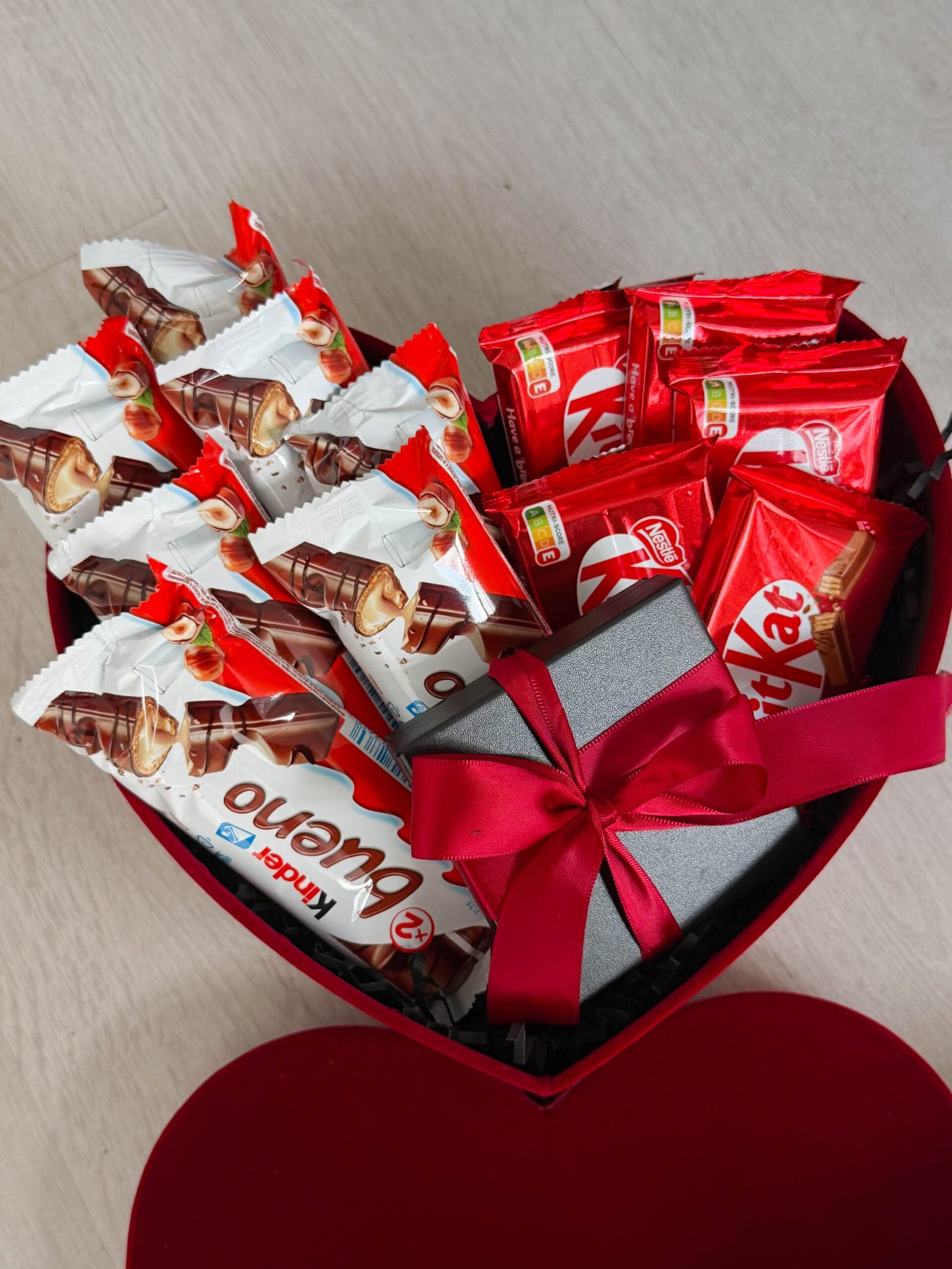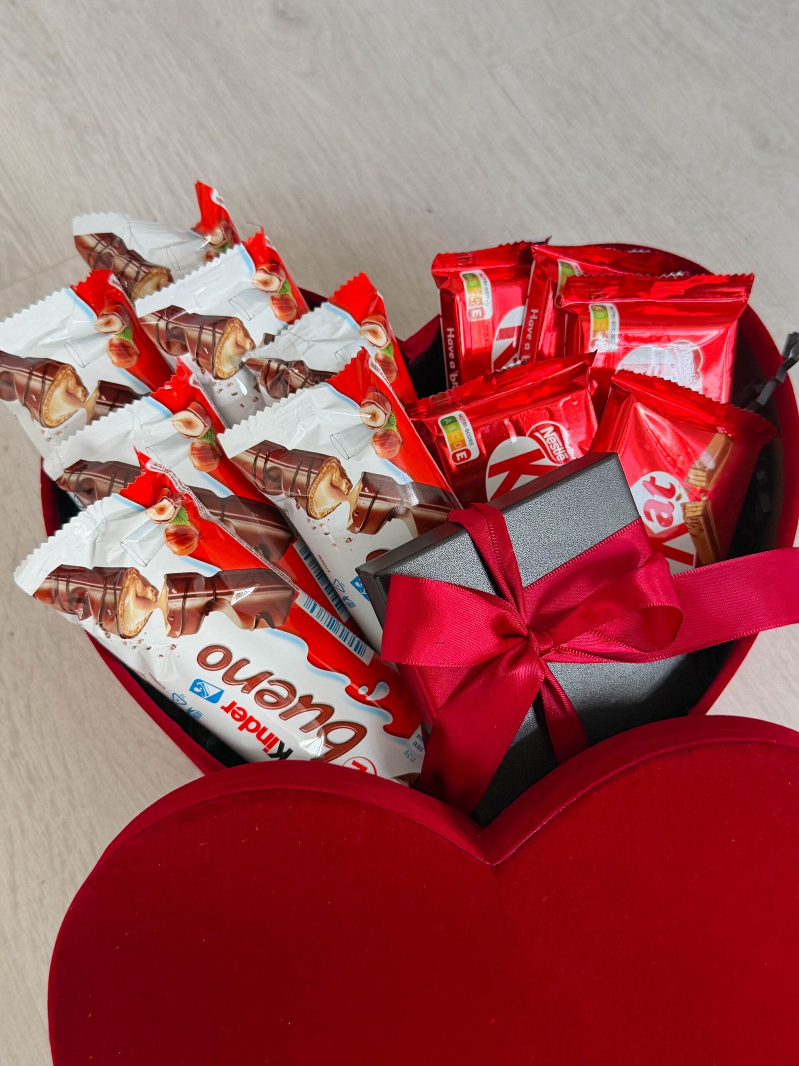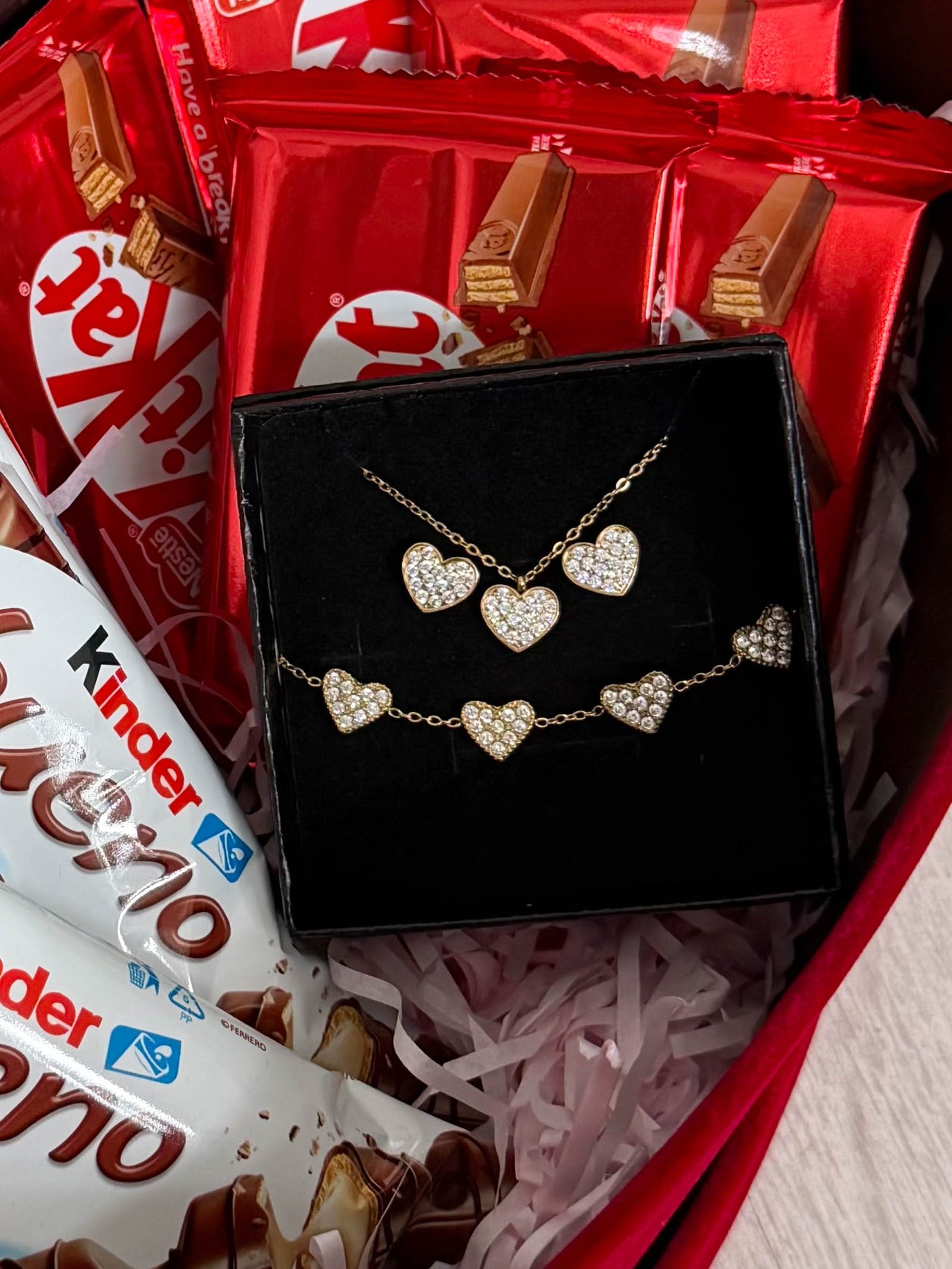 Ένα εντυπωσιακό κουτί σε σχήμα καρδιάς, γεμάτο αγαπημένες σοκολατένιες απολαύσεις και ένα κομψό σετ κοσμημάτων.